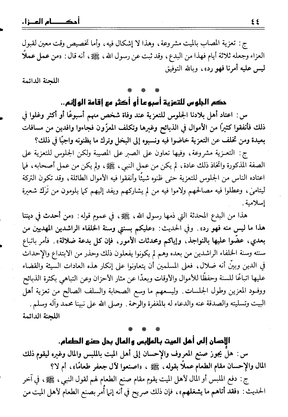 هذا من البدع المحدثة التي ذمها رسول الله، صلى الله عليه وسلم، في عموم قوله ((من أحدث في ديننا هذا ما ليس منه فهو رد)) . وفي الحديث ((عليكم بسنتي وسنة الخلفاء الراشدين المهديين من بعدي، عضّوا عليها بالنواجذ، وإياكم ومحدثات الأمور، فإن كل بدعة ضلالة)) . فأمر باتباع سنته وسنة الخلفاء الراشدين من بعده وهم لم يكونوا يفعلون ذلك وحذر من الابتداع والإحداث في الدين وبيّن أنه ضلال، فعلى المسلمين أن يتعاونوا على إنكار هذه العادات السيئة والقضاء عليها اتباعاً للسنة وحفظاً للأموال والأوقات وبعداً عن مثار الأحزان وعن التباهي بكثرة الذبائح ووفود المعزين وطول الجلسات. وليسعهم ما وسع الصحابة والسلف الصالح من تعزية أهل البيت وتسليته والصدقة عنه والدعاء له بالمغفرة والرحمة. وصلى الله على نبينا محمد وآله وسلم.