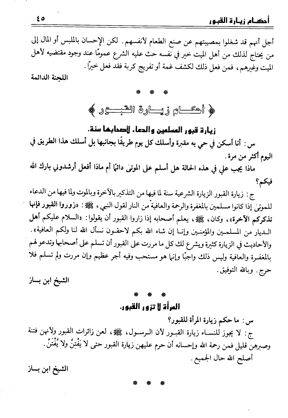 ج زيارة القبور الزيارة الشرعية سنة لما فيها من التذكير بالآخرة وبالموت ولما فيها من الدعاء للموتى إذا كانوا مسلمين بالمغفرة والرحمة والعافية من النار لقول النبي، صلى الله عليه وسلم ((زوروا القبور فإنها تذكركم الآخرة)) ، وكان، صلى الله عليه وسلم، يعلم أصحابه إذا زاروا القبور أن يقولوا ((السلام عليكم أهل الديار من المسلمين والمؤمنين وإنا إن شاء الله بكم لاحقون نسأل الله لنا ولكم العافية)) .