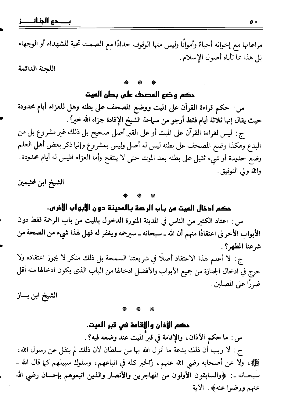 ج ليس لقراءة القرآن على الميت أو على القبر أصل صحيح بل ذلك غير مشروع بل من البدع وهكذا وضع المصحف على بطنه ليس له أصل وليس بمشروع وإنما ذكر بعض أهل العلم وضع حديدة أو شيء ثقيل على بطنه بعد الموت حتى لا ينتفح وأما العزاء فليس له أيام محدودة.