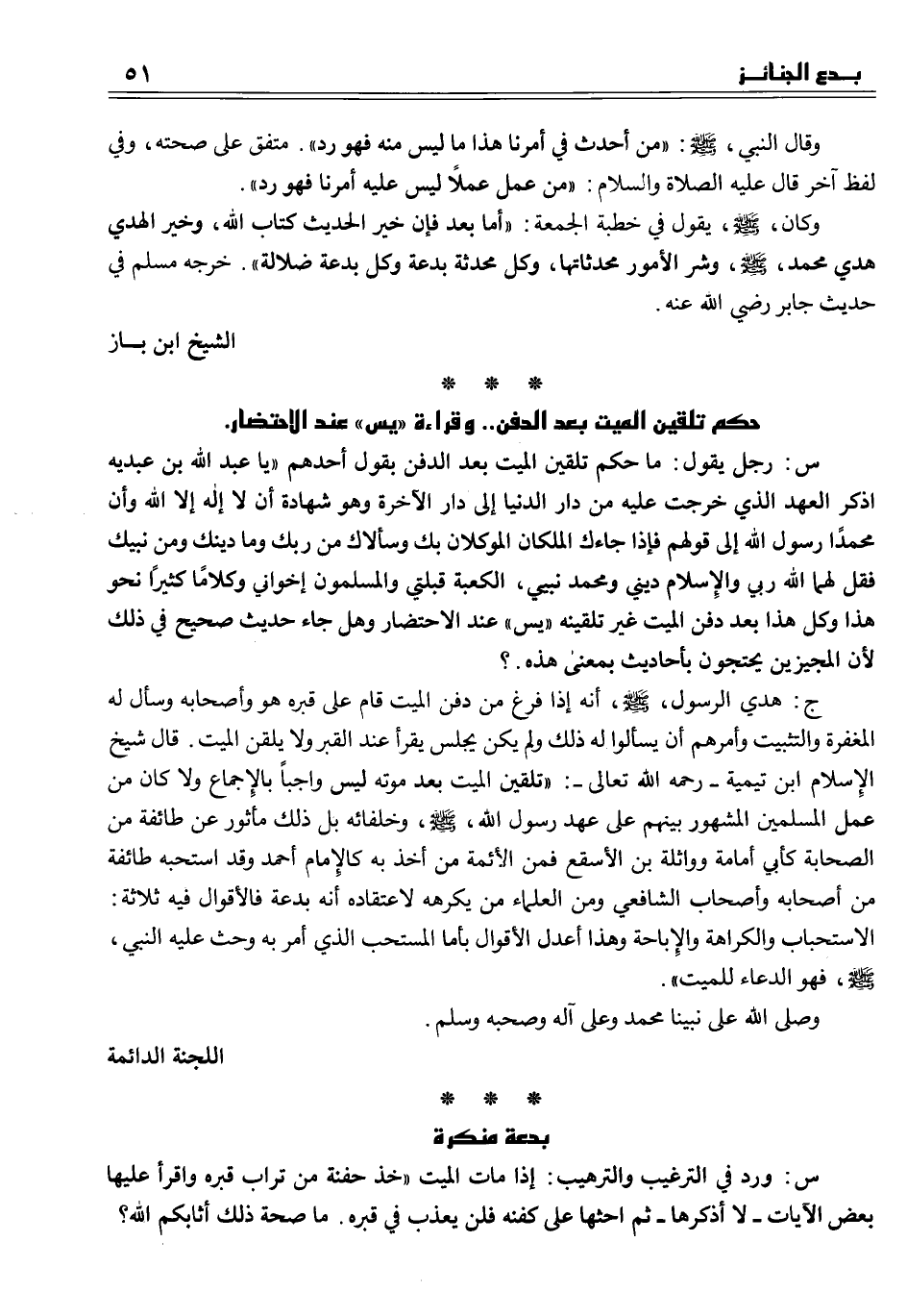 ج هدي الرسول، صلى الله عليه وسلم، أنه إذا فرغ من دفن الميت قام على قبره هو وأصحابه وسأل له المغفرة والتثبيت وأمرهم أن يسألوا له ذلك ولم يكن يجلس يقرأ عند القبر ولا يلقن الميت. قال شيخ الإسلام ابن تيمية ـ رحمه الله تعالى ـ ((تلقين الميت بعد موته ليس واجباً بالإجماع ولا كان من عمل المسلمين المشهور بينهم على عهد رسول الله، صلى الله عليه وسلم، وخلفائه بل ذلك مأثور عن طائفة من الصحابة كأبي أمامة وواثلة بن الأسقع فمن الأئمة من أخذ به كالإمام أحمد وقد استحبه طائفة من أصحابه وأصحاب الشافعي ومن العلماء من يكرهه لا عتقاده أنه بدعة فالأقوال فيه ثلاثة الاستحباب والكراهة والإباحة وهذا أعدل الأقوال بأما المستحب الذي أمر به وحث عليه النبي، صلى الله عليه وسلم، فهو الدعاء للميت)) .