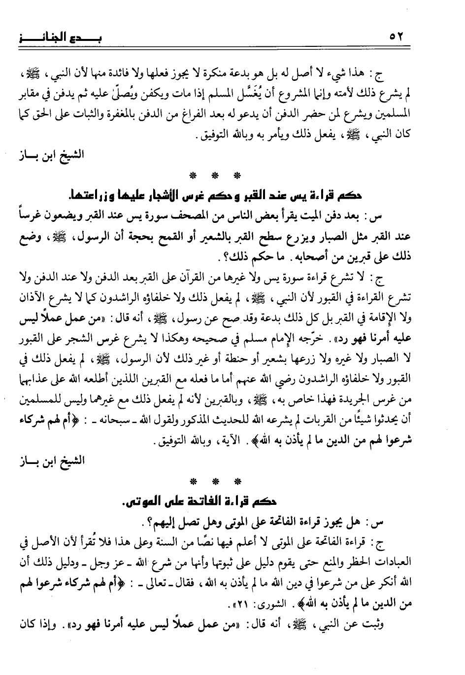 ج قراءة الفاتحة على الموتى لا أعلم فيها نصاً من السنة وعلى هذا فلا تُقرأ لأن الأصل في العبادات الحظر والمنع حتى يقوم دليل على ثبوتها وأنها من شرع الله ــ عز وجل ــ ودليل ذلك أن الله أنكر على من شرعوا في دين الله ما لم يأذن به الله، فقال ــ تعالى ــ (أم لهم شركاء شرعوا لهم من الدين ما لم يأذن به الله) . الشورى 21)) .