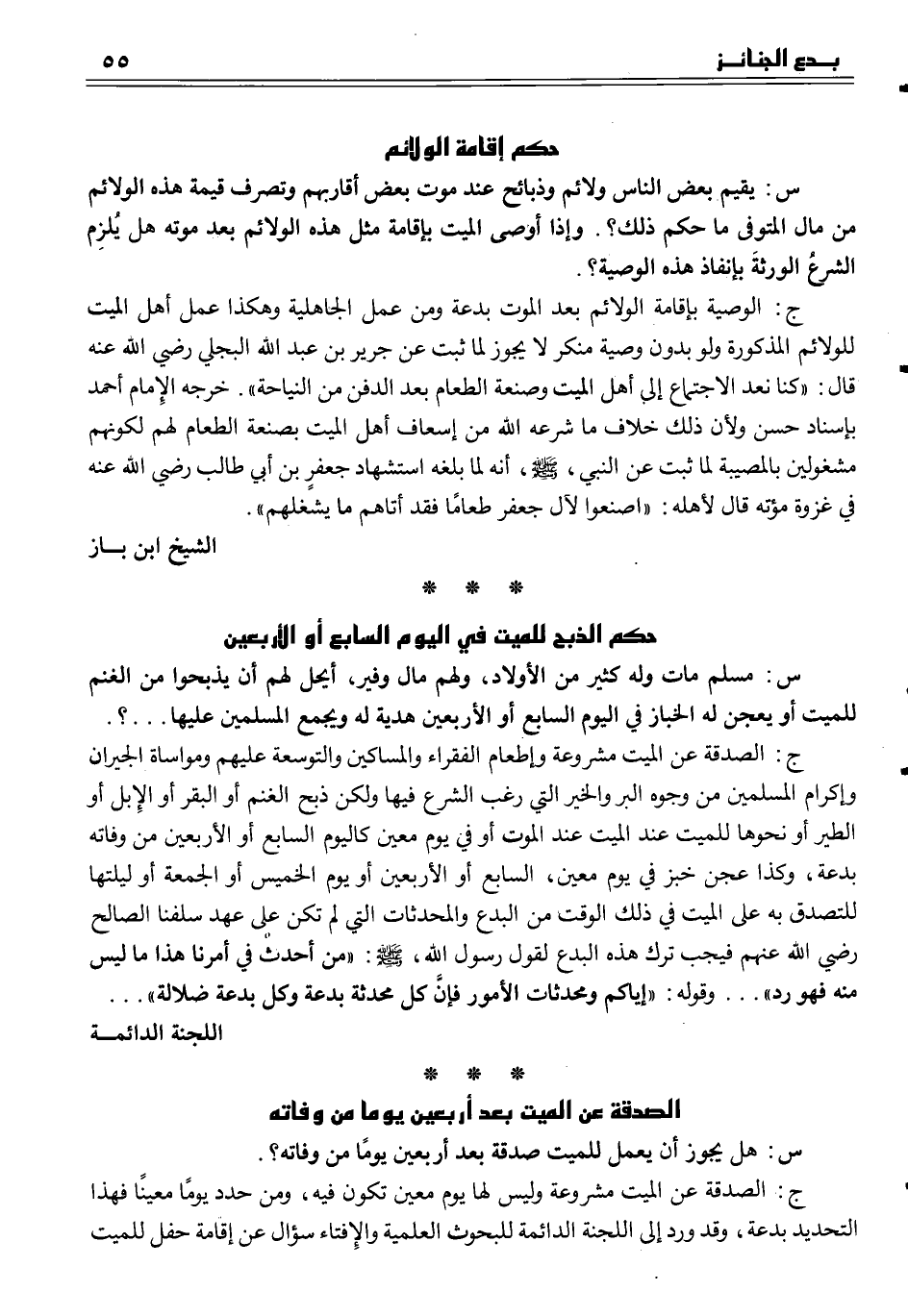ج الصدقة عن الميت مشروعة وإطعام الفقراء والمساكين والتوسعة عليهم ومواساة الجيران وإكرام المسلمين من وجوه البر والخير التي رغب الشرع فيها ولكن ذبح الغنم أو البقر أو الإبل أو الطير أو نحوها للميت عند الميت عند الموت أو في يوم معين كاليوم السابع أو الأربعين من وفاته بدعة، وكذا عجن خبز في يوم معين، السابع أو الأربعين أو يوم الخميس أو الجمعة أو ليلتها للتصدق به على الميت في ذلك الوقت من البدع والمحدثات التي لم تكن على عهد سلفنا الصالح رضي الله عنهم فيجب ترك هذه البدع لقول رسول الله، صلى الله عليه وسلم ((من أحدث في أمرنا هذا ما ليس منه فهو رد)) . . . وقوله ((إياكم ومحدثات الأمور فإنَّ كل محدثة بدعة وكل بدعة ضلالة)) . . .