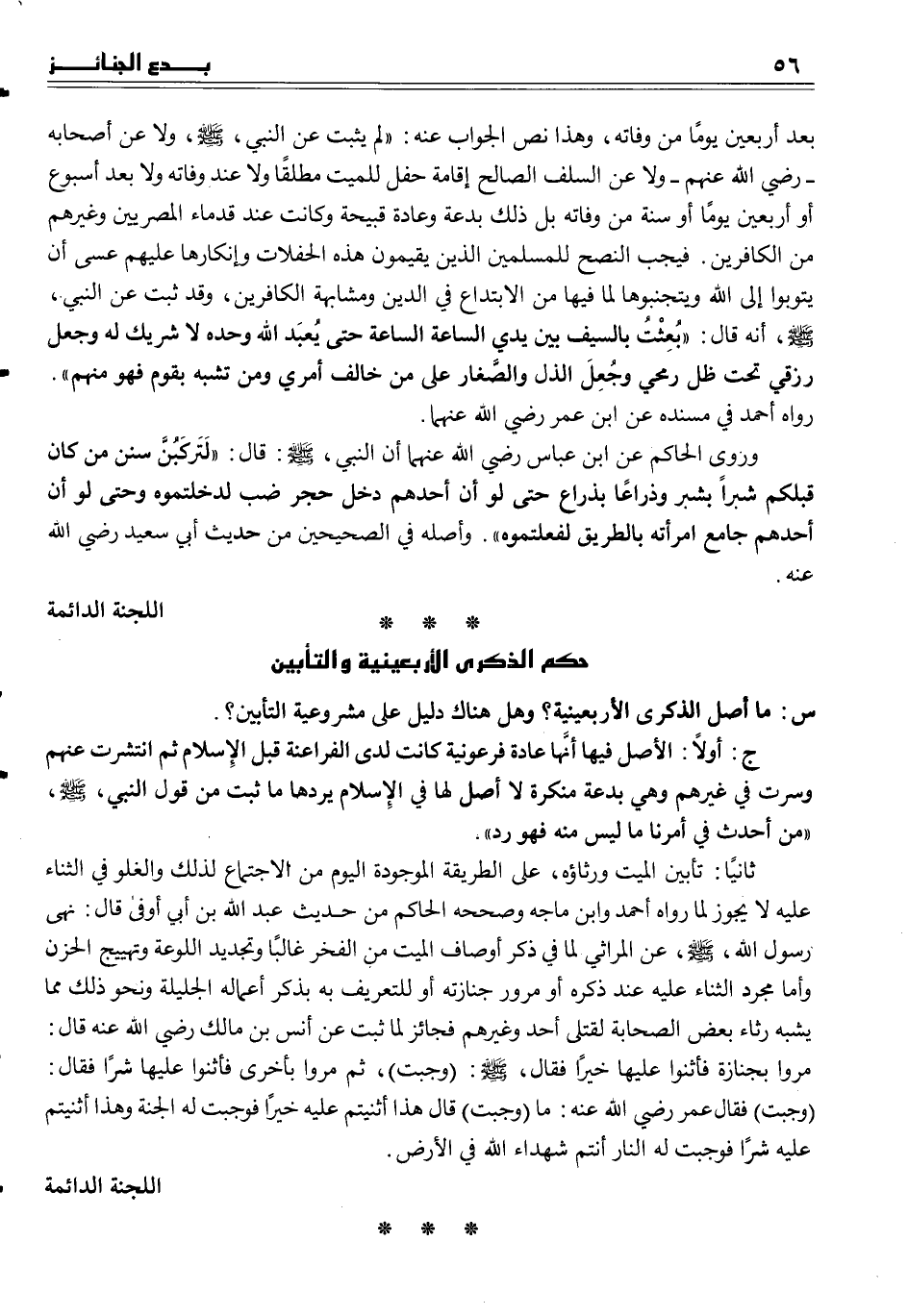 بعد أربعين يوماً من وفاته، وهذا نص الجواب عنه ((لم يثبت عن النبي، صلى الله عليه وسلم، ولا عن أصحابه ــ رضي الله عنهم ــ ولا عن السلف الصالح إقامة حفل للميت مطلقاً ولا عند وفاته ولا بعد أسبوع أو أربعين يوماً أو سنة من وفاته بل ذلك بدعة وعادة قبيحة وكانت عند قدماء المصريين وغيرهم من الكافرين. فيجب النصح للمسلمين الذين يقيمون هذه الحفلات وإنكارها عليهم عسى أن يتوبوا إلى الله ويتجنبوها لما فيها من الابتداع في الدين ومشابهة الكافرين، وقد ثبت عن النبي، صلى الله عليه وسلم، أنه قال ((بُعِثْتُ بالسيف بين يدي الساعة الساعة حتى يُعبَد الله وحده لا شريك له وجعل رزقي تحت ظل رمحي وجُعِلَ الذل والصَّغار على من خالف أمري ومن تشبه بقوم فهو منهم)) .