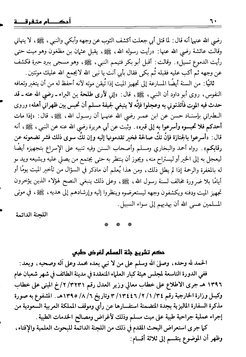 الحمد لله وحده، وصلى الله وسلم على نبي بعده محمد وعلى آله وصحبه، وبعد ففي الدورة التاسعة لمجلس هيئة كبار العلماء المنعقدة في مدينة الطائف في شهر شعبان عام 1396هـ جرى الاطلاع على خطاب معالي وزير العدل رقم3231 2 خ المبنى على خطاب وكيل وزارة الخارجية رقم34 1 2 13446 3وتاريخ6 8 1395هـ. المشفوع به صورة مذكرة السفارة الماليزية بجدة المتضمنة استفسارها عن رأي وموقف المملكة العربية السعودية من إجراء عملية جراحية طبية على ميت مسلم وذلك لأغراض ومصالح الخدمات الطبية.