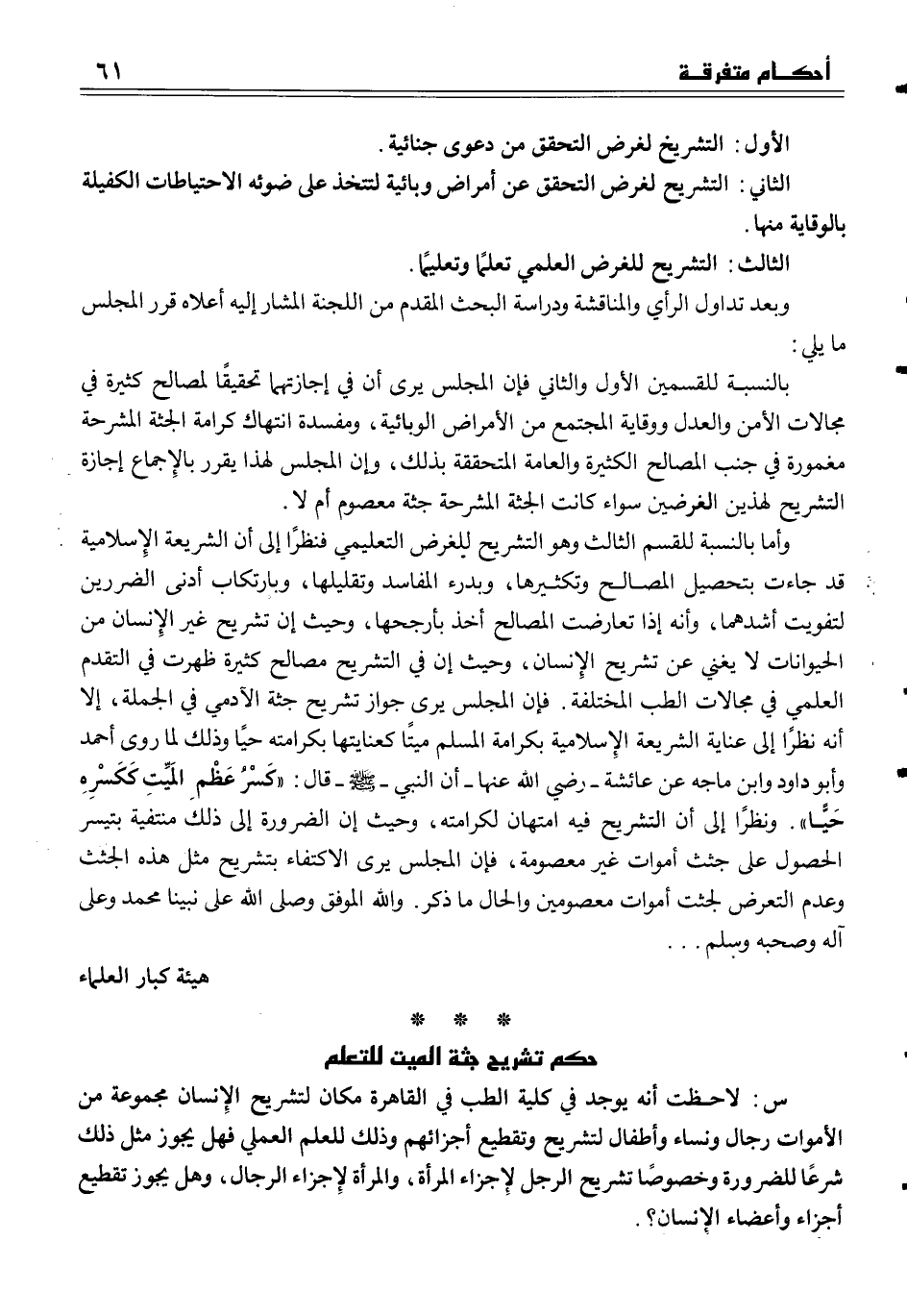 وأما بالنسبة للقسم الثالث وهو التشريح للعرض التعليمي فنظراً إلى أن الشريعة الإسلامية قد جاءت بتحصيل المصالح وتكثيرها، وبدرء المفاسد وتقليلها، وبارتكاب أدنى الضررين لتفويت أشدهما، وأنه إذا تعارضت المصالح أخذ بأرجحها، وحيث إن تشريح غير الإنسان من الحيوانات لا يغني عن تشريح الإنسان، وحيث إن في التشريح مصالح كثيرة ظهرت في التقدم العلمي في مجالات الطب المختلفة. فإن المجلس يرى جواز تشريح جثة الآدمي في الجملة، إلا أنه نظراً إلى عناية الشريعة الإسلامية بكرامة المسلم ميتاً كعنايتها بكرامته حياً وذلك لما روى أحمد وأبو داود ابن ماجه عن عائشة ــ رضي الله عنها ــ أن النبي، صلى الله عليه وسلم، قال ((كَسْرُ عَظْمِ الَمَّيتِ كَكَسْرِهِ حَيََّا)) . ونظراً إلى أن التشريح فيه امتهان لكرامته، وحيث إن الضرورة إلى ذلك منتفية بتيسر الحصول على جثث أموات غير معصومة، فإن المجلس يرى الاكتفاء بتشريح مثل هذه الجثث وعدم التعرض لجثث أموات معصومين والحال ما ذكر. والله الموفق وصلى الله على نبينا محمد وعلى آله وصحبه وسلم. . .