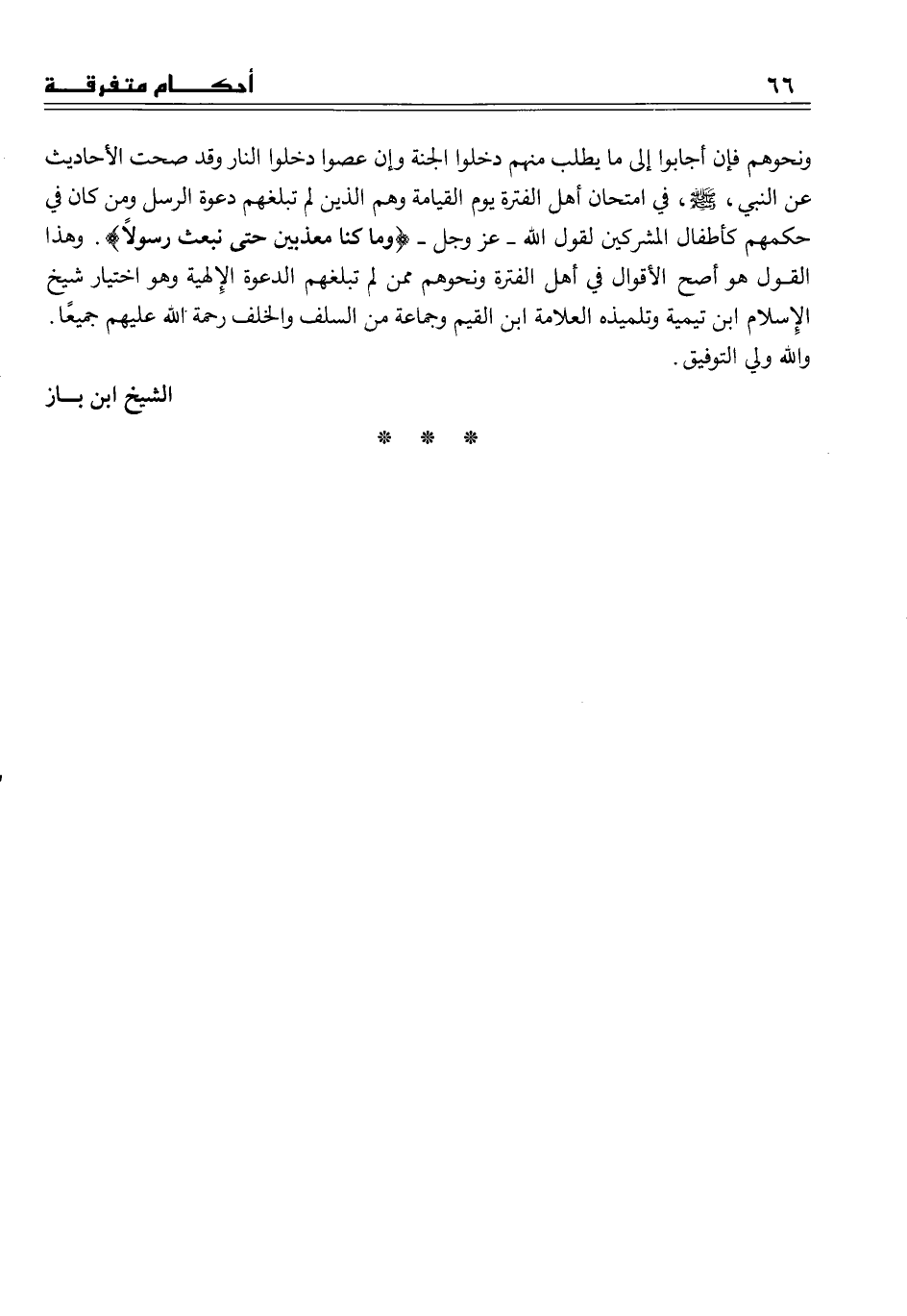 ونحوهم فإن أجابوا إلى ما يطلب منهم دخلوا الجنة وإن عصوا دخلوا النار وقد صحت الأحاديث عن النبي، صلى الله عليه وسلم، في امتحان أهل الفترة يوم القيامة وهم الذين لم تبلغهم دعوة الرسل ومن كان في حكمهم كأطفال المشركين لقول الله ــ عز وجل ــ (وما كنا معذبين حتى نبعث رسولاً) . وهذا القول هو أصح الأقوال في أهل الفترة ونحوهم ممن لم تبلغهم الدعوة الإلهية وهو اختيار شيخ الإسلام ابن تيمية وتلميذه العلامة ابن القيم وجماعة ابن القيم وجماعة السلف والخلف رحمة الله عليهم جميعاً.