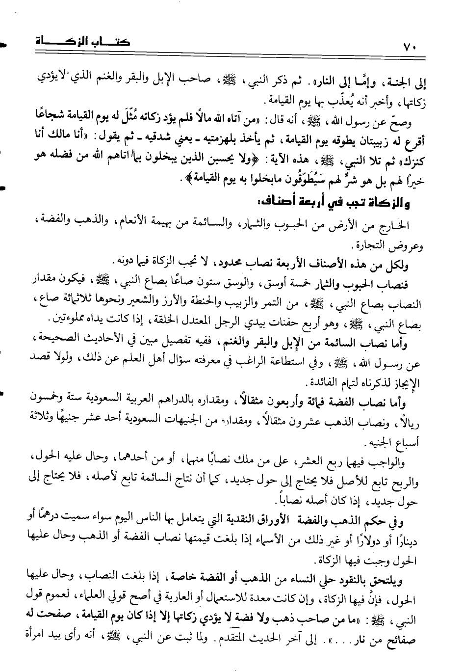 وصحّ عن رسول الله، صلى الله عليه وسلم، أنه قال ((من آتاه الله مالاً فلم يؤد زكاته مُثّلَ له يوم القيامة شجاعاً أقرع له زبيبتان يطوقه يوم القيامة، ثم يأخذ بلهزمتيه ــ يعني شدقيه ــ ثم يقول ((أنا مالك أنا كنزك)) ثم تلا النبي، صلى الله عليه وسلم، هذه الآية ((ولا يحسبن الذين يبخلون بما أتاهم الله من فضله هو خيراً لهم بل هو شرٌّ لهم سَيُطَوّقُون ما بخلوا به يوم القيامة) .