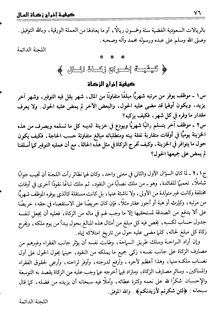 ج1، 2 ـ لما كان السؤال الأول والثاني في معنى واحد، وكان لهما نظائر رأت اللجنة أن تجيب جواباً شاملاً، تعميماً للفائدة، وهو ـ من ملك نصاباً من النقود، ثم ملك تباعاً نقوداً أخرى في أوقات مختلفة وكانت غير متولدة من الأولى، ولا ناشئة عنها، بل كانت مستقلة كالذي يوفره الموظف شهرياً من مرتبه، وكإرث أو هبة أو أجور عقار مثلاً، فإن كان حريصاً على الاسقصاء في حقه؛ حريصاً على ألا يدفع من الصدقة لمستحقيها إلا ما وجب لهم في ماله من الزكاة، فعليه أن يجعل لنفسه جدول حساب لكسبه، يخص فيه كل مبلغ من أمثال هذه المبالغ بحول يبدأ من يوم ملكه، ويخرج زكاة كل مبلغ لحاله، كلما مضى عليه حولمن تاريخ امتلاكه إياه.