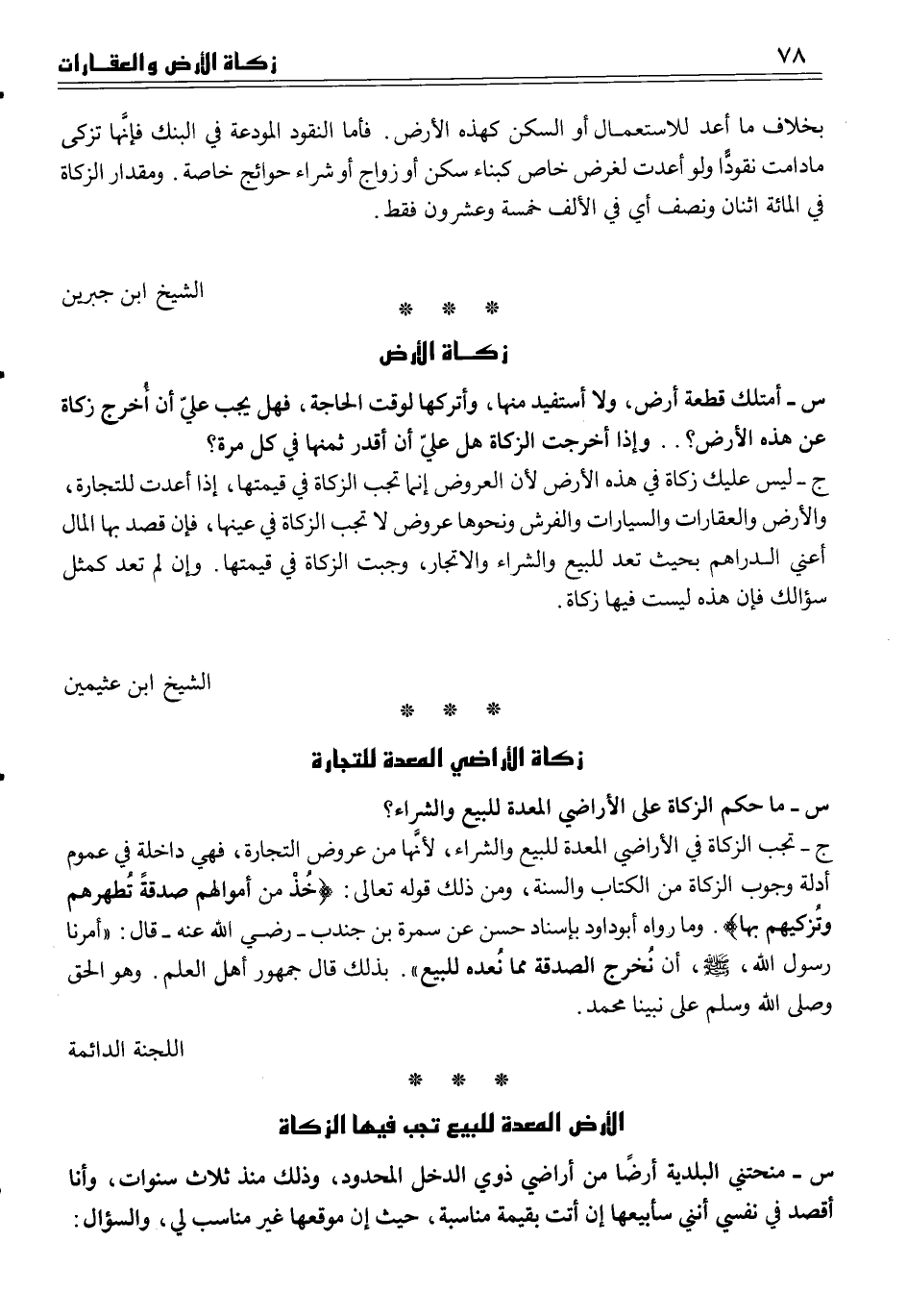ج ـ ليس عليك زكاة في هذه الأرض لأن العروض إنما تجب الزكاة في قيمتها، إذا أعدت للتجارة، والأرض والعقارات والسيارات والفرش ونحوها عروض لا تجب الزكاة في عينها، فإن قصد بها المال أعني الدراهم بحيث تعد للبيع والشراء والاتجار، وجبت الزكاة في قيمتها. وإن لم تعد كمثل سؤالك فإن هذه ليست فيها زكاة.
