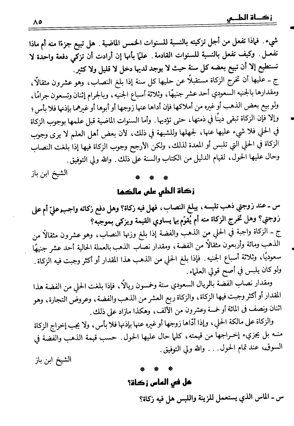 ج ــ الزكاة واجبة في الحلي من الذهب والفضة، إذا بلغ وزنها النصاب، وهو عشرون مثقالاً من الذهب ومائة وأربعون مثقالاً من الفضة، ومقدار نصاب الذهب بالعملة الحالية أحد عشر جنيهاً سعودياً، وثلاثة أسباع الجنيه. فإذا بلغ الحلي من الذهب هذا المقدار أو أكثر وجبت فيه الزكاة. ولو كان يلبس في أصح قولي العلماء.