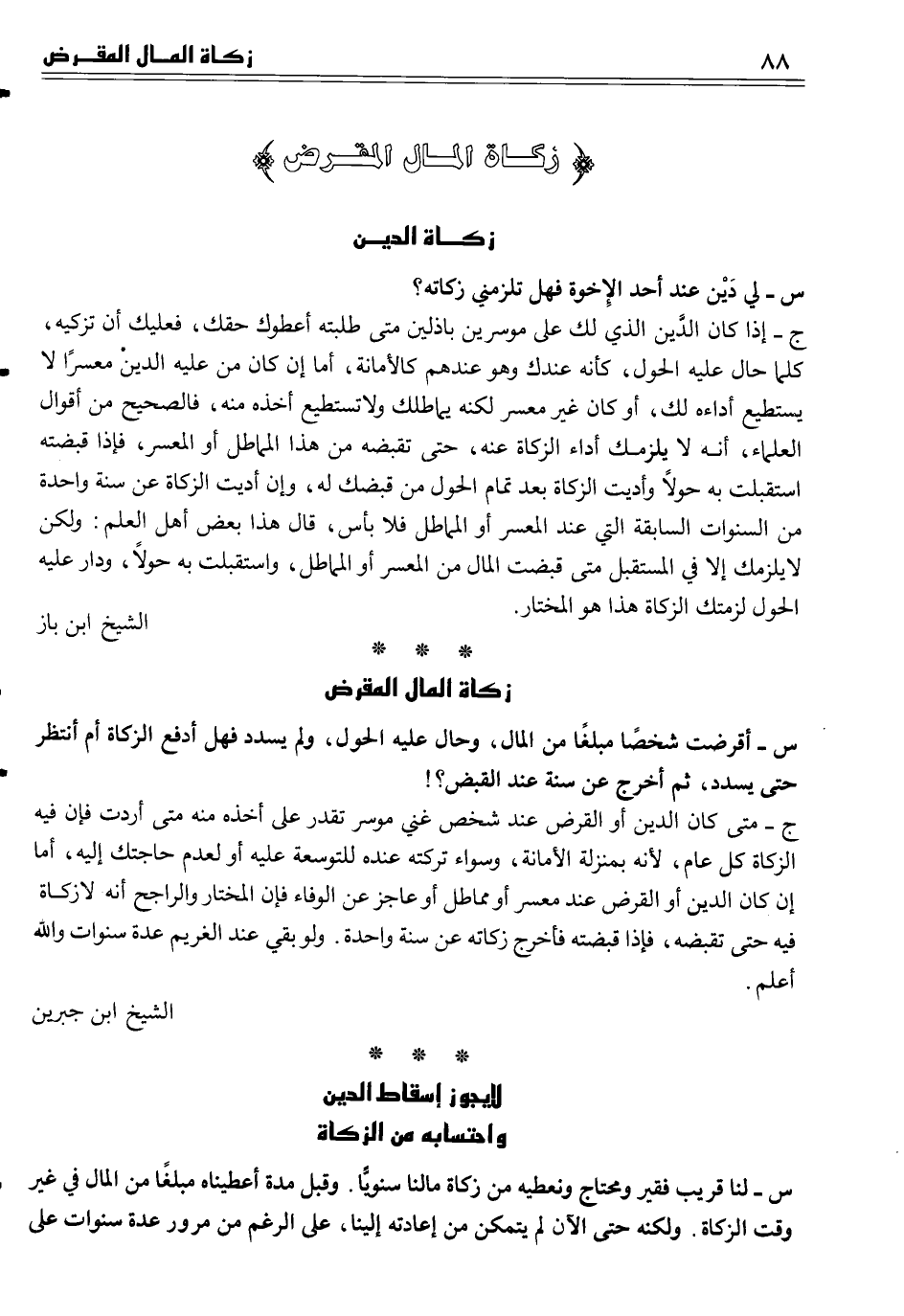 د ـ متى كان الدين أو القرض عند شخص غني موسر تقدر على أخذه منه متى أردت فإن فيه الزكاة كل عام، لأنه بمنزلة الأمانة، وسواء تركته عنده للتوسعة عليه أو لعدم حاجتك إليه، أما إن كان الدين أو القرض عند معسر أو مماطل أو عاجز عن الوفاء فإن المختار والراجح أنه لا زكاة فيه حتى تقبضه، فإذا قبضته فأخرج زكاته عن سنة واحدة. ولو بقي عند الغريم عدة سنوات والله أعلم.