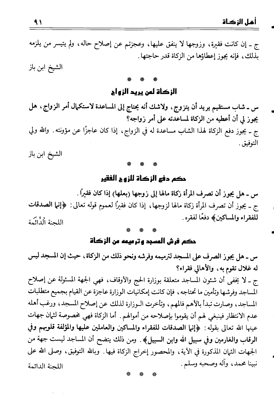 ج ـ يجوز أن تصرف المرأة زكاة مالها لزوجها، إذا كان فقيراً لعموم قوله تعالى (إنما الصدقات للفقراء والمساكين) دفعاً لفقره.