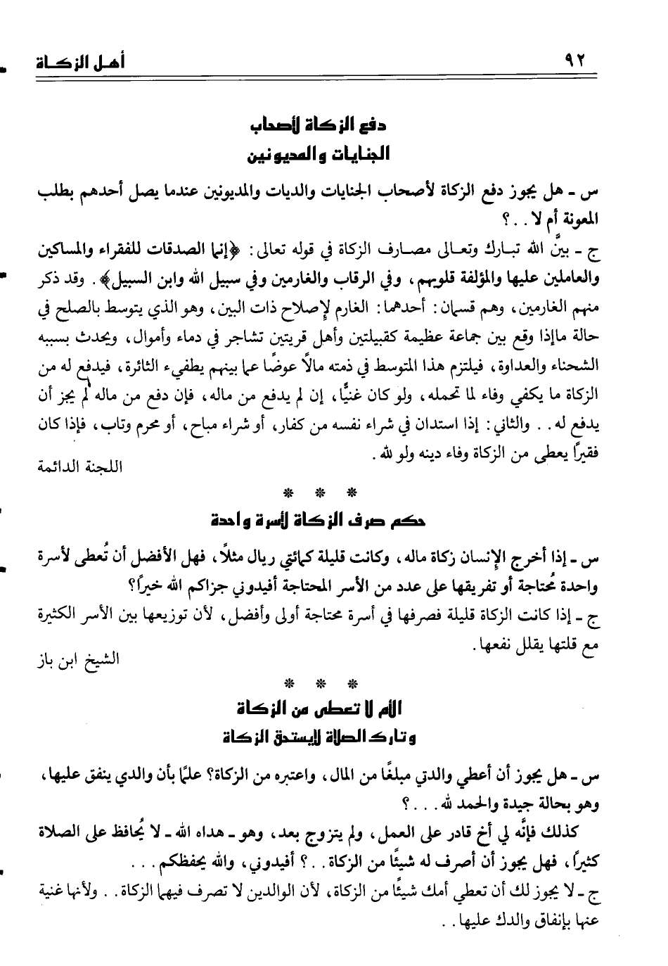 الأم لا تعطى من الزكاة وتارك الصلاة لايستحق الزكاة