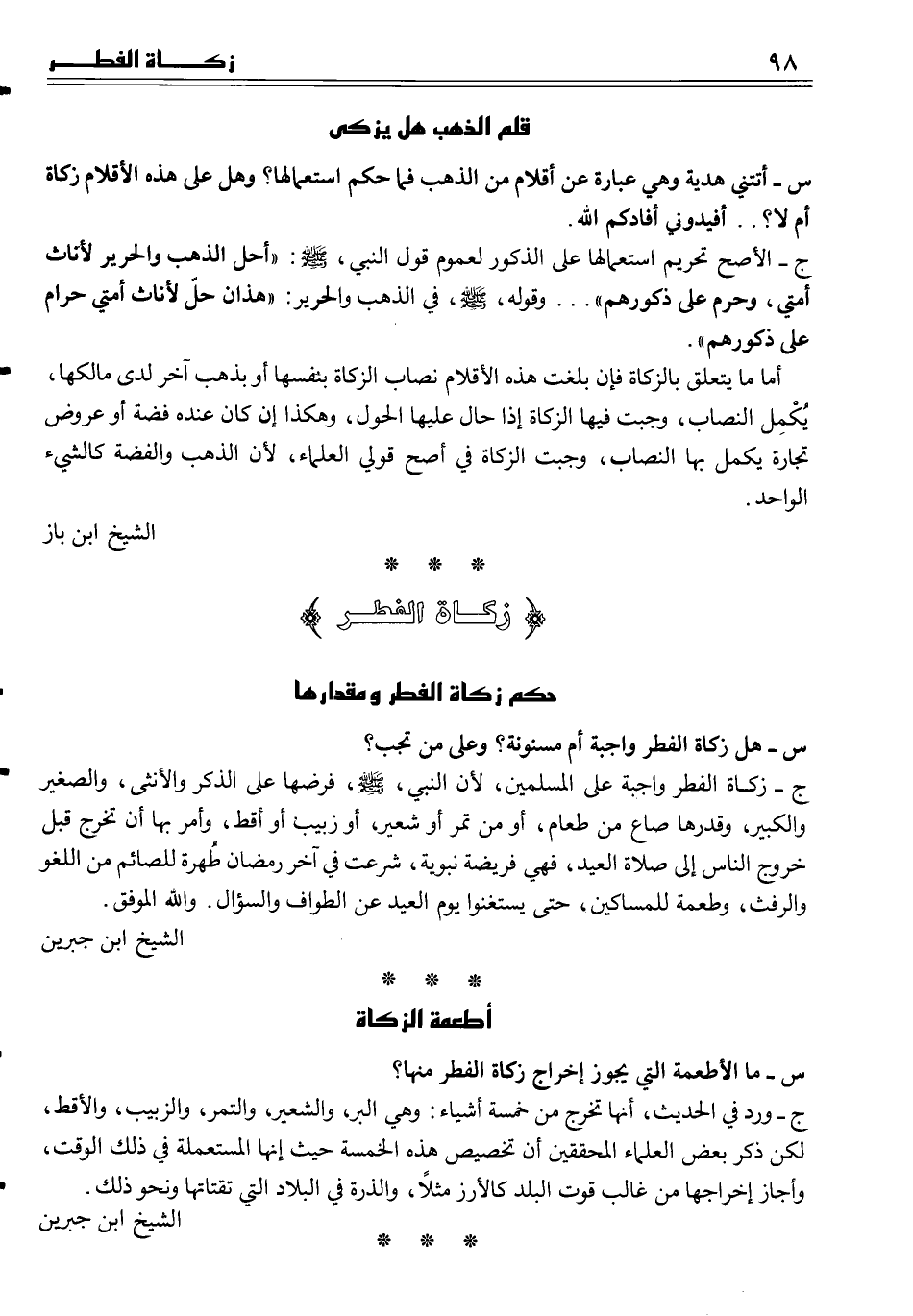 ج زكاة الفطر واجبه على المسلمين، لأن النبي، صلى الله عليه وسلم، فرضها على الذكر والأنثى، والصغير والكبير، وقدرها صاع من طعام، أو من تمر أو شعير، أو زبيب أو أقط، وأمر بها أن تخرج قبل خروج الناس إلى صلاة العيد، فهي فريضة نبوية، شرعت في آخر رمضان طُهرة للصائم من اللغو والرفث، وطعمة للمساكين، حتى يستغنوا يوم العيد عن الطواف والسؤال. والله الموفق.