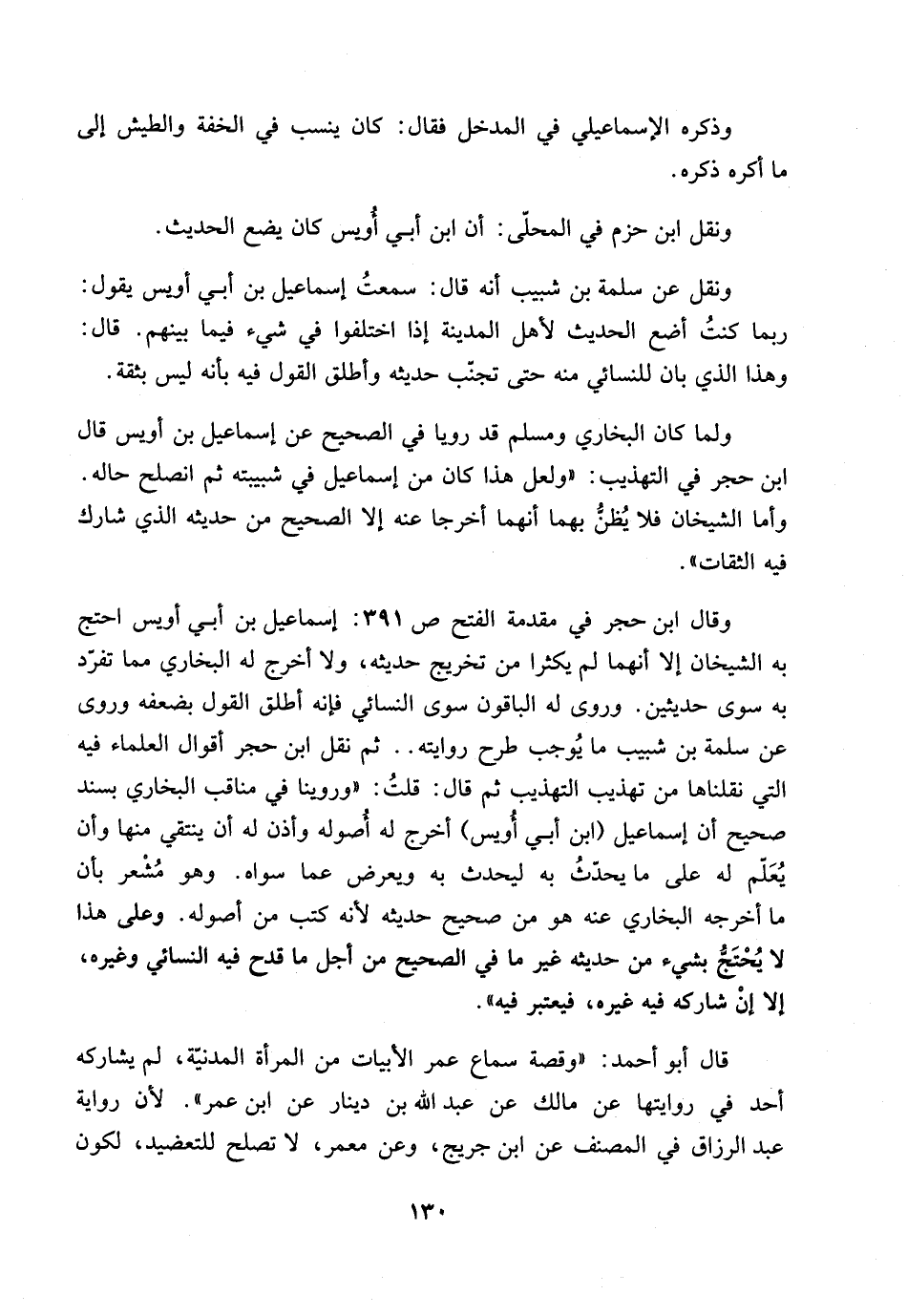 وروى له الباقون سوى النسائي فإنه أطلق القول بضعفه وروى عن سلمة بن شبيب ما يُوجب طرح روايته .. ثم نقل ابن حجر أقوال العلماء فيه التي نقلناها من تهذيب التهذيب ثم قال: قلتُ: " وروينا في مناقب البخاري بسند صحيح أن إسماعيل (ابن أبي أُويس) أخرج له أُصوله وأذن له أن ينتقي منها وأن يُعَلّم له على ما يحدّثُ به ليحدث به ويعرض عما سواه. وهو مُشْعر بأن ما أخرجه البخاري عنه هو من صحيح حديثه لأنه كتب من أصوله. وعلى هذا لا يُحْتَجُّ بشيء من حديثه غير ما في الصحيح من أجل ما قدح فيه النسائي وغيره، إلا أنْ شاركه فيه غيره، فيعتبر فيه ".
