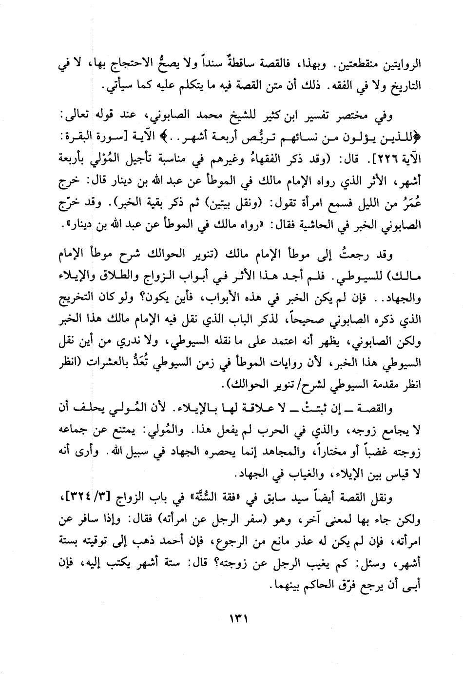 وقد رجعتُ إلى موطأ الإمام مالك (تنوير الحوالك شرح موطأ الإمام مالك) للسيوطي. فلم أجد هذا الأثر في أبواب الزواج والطلاق والإيلاء والجهاد .. فإن لم يكن الخبر في هذه الأبواب، فأين يكون؟ ولو كان التخريج الذي ذكره الصابوني صحيحاً، لذكر الباب الذي نقل فيه الإمام مالك هذا الخبر ولكن الصابوني، يطهر أنه اعتمد على ما نقله السيوطي، ولا ندري من أين نقل السيوطي هذا الخبر، لأن روايات الموطأ في زمن السيوطي تُعَدُّ بالعشرات (انظر انظر مقدمة السيوطي لشرح / تنوير الحوالك).