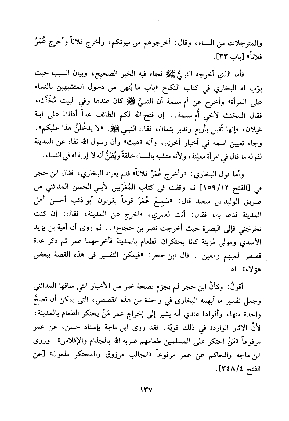 أقولُ: وكأنَّ ابن حجر لم يجزم بصحة خبر من الأخبار التي ساقها المدائني وجعل تفسير ما أبهمه البخاري في واحدة من هذه القصص، التي يمكن أن تصحَّ واحدة منها، وأقواها عندي أنه يشير إلى إخراج عمر مَنْ يحتكر الطعام بالمدينة، لأنَّ الآثار الواردة في ذلك قويّة. فقد روى ابن ماجه بإسناد حسن، عن عمر مرفوعاً " مَنْ احتكر على المسلمين طعامهم ضربه الله بالجذام والإفلاس ".
