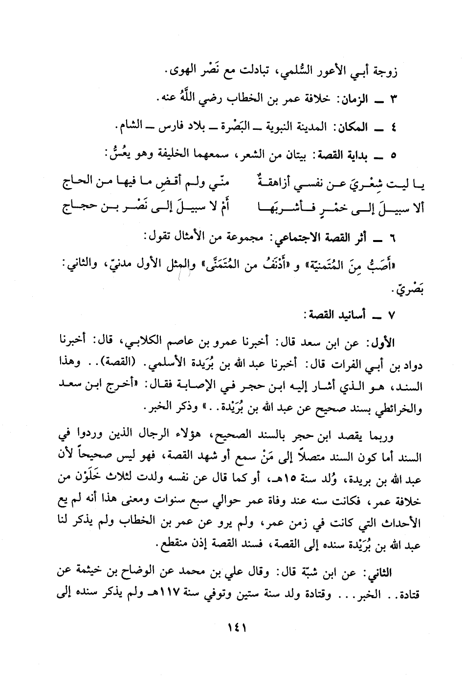 5 ـ بداية القصة: بيتان من الشعر، سمعها الخليفة وهو يعُسُّ: ياليت شِعْريَ عن نفسي أزاهقةٌ منّي ولم أقضِ ما فيها من الحاج ألا سبيلَ إلى خمْرٍ فأشربَها أَمْ لا سبيلَ إلى نَصْر بن حجاج