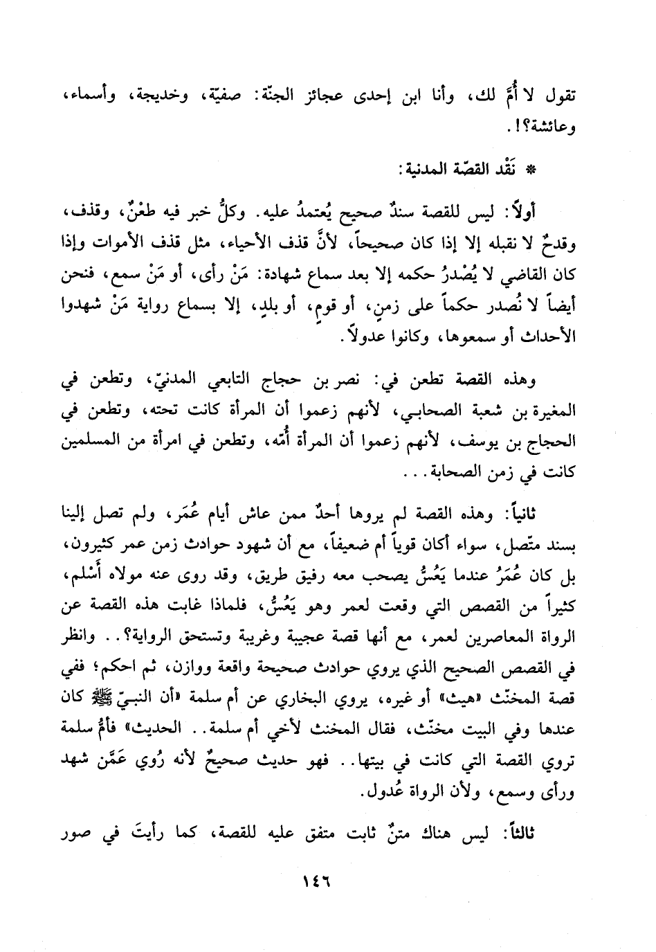وهذه القصة تطعن في: نصر بن حجاج التابعي المدنيّ، وتطعن في المغيرة بن شعبة الصحابي، لأنهم زعموا أم المرأة كانت تحته، وتطعن في الحجاج بن يوسف، لأنهم زعموا أنَّ المرأة أُمّه، وتطعن في امرأة من المسلمين كانت في زمن الصحابة ...