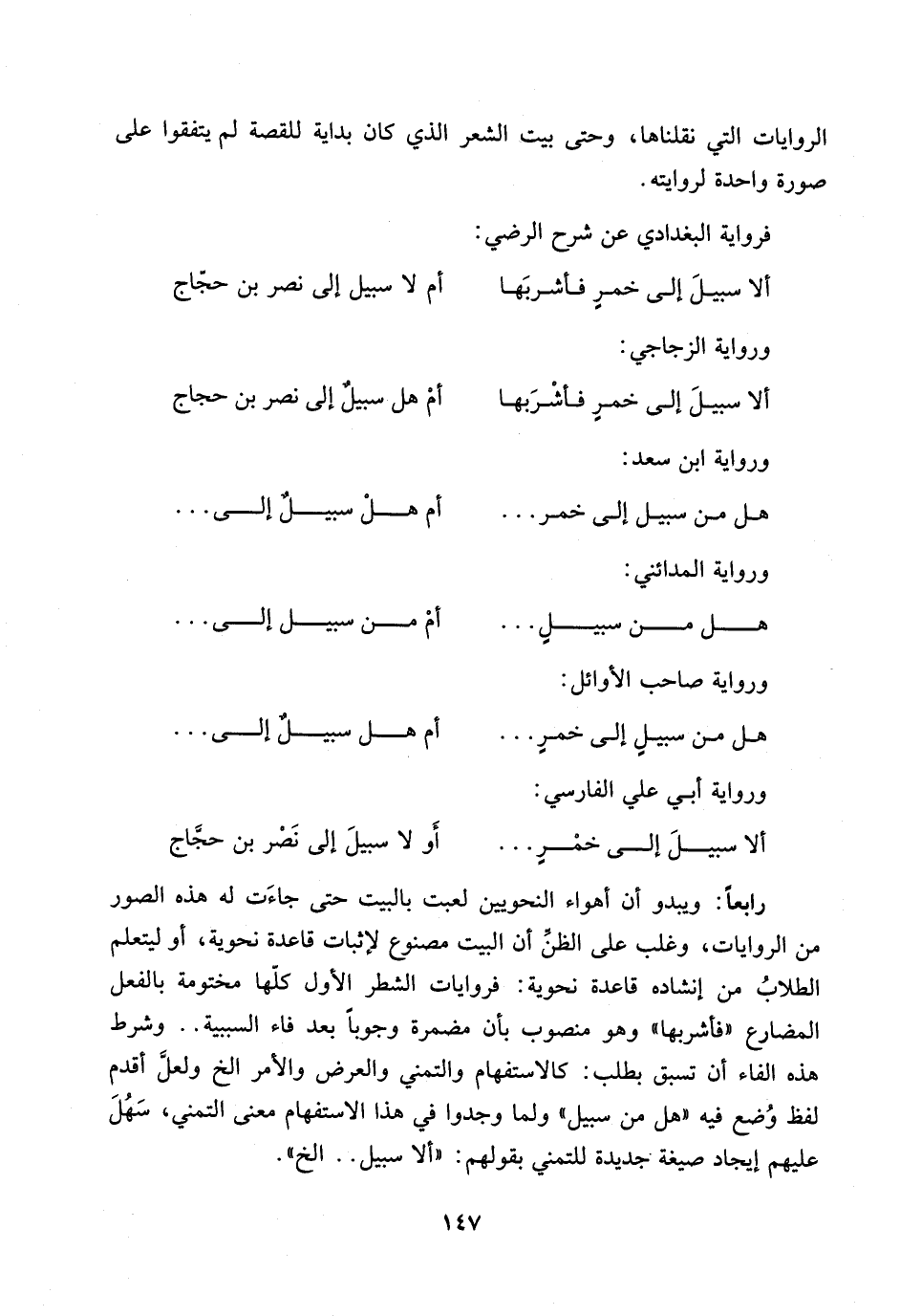 رابعاُ: ويبدو أن أهواء النحويين لعبت بالبيت حتى جاءَت له هذه الصور من الروايات، وغلب على الظنِّ أن البيت مصنوع لإثبات قاعدة نحوية، أو ليتعلم الطلابُ من إنشاده قاعدة نحوية: فروايات الشطر الأول كلَّها مختومة بالفعل المضارع "فأشربها" وهو منصوب بأن مضمرة وجوباُ بعد فاء السببية .. وشرط هذه الفاء أن تسبق بطلب: كالاستفهام والتمني والعرض والأمر الخ ولعلَّ أقدام لفظ وُضع فيه "هل من سبيل" ولما وجدوا في هذا الاستفهام معنى التمني، سَهُلَ عليهم إيجاد صيغة جديدة للتمني بقولهم: "ألا سبيل .. الخ ".
