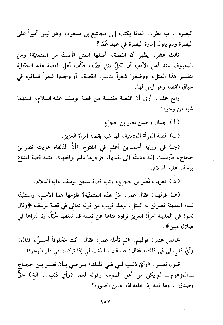 قول نصر: "وأيُّ دنب لي في ذلك " يوحي بأن نصر بن حجاج ـ المزعوم ـ لم يكن من أهل السوء، وقوله لعمر (وأي ذنب .. الخ) حقٌّ وصدق .. وما ذنبه إذا خلقه الله حسن الصورة؟ …