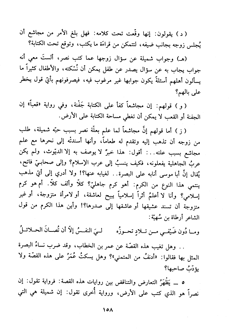 (ز) أما قولهم إنَّ مجاشعاً لما علم بعلّة نصر بسبب حبّه شميلة، طلب من زوجه أن تذهب إليه وتقدم له طعاماً، وأنها أسندته إلى نحرها مع العلم مجاشع بسبب علته .. : أقول: هذا خبرٌ لا يوصف به إلا الديّوث، ولم يكن عربُ الجاهلية يفعلونه، فكيف ينسب إلى عرب الإسلام؟ وإلى صحابيّ فاتح، يُقال إنَّ أبا موسى أنابه على البصرة .. لغيابه عنها؟ ! ولا أدري إلى أيّ مذهب ينتمي هذا النوع من الكرم: أهو كرم جاهليّ؟ كلاّ وألف كلاّ.