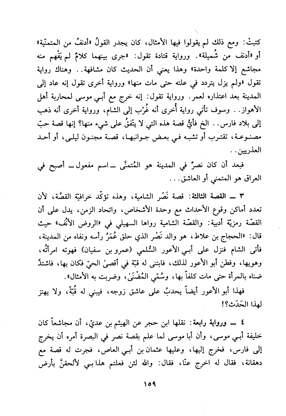 ورواية تقول: إنه خرج مع أبي موسى لحاربة أهل الأهواز .. وسوف تأتي رواية أُخرى أنه غُرّب إلى الشام، ورواية أُخرى أنه ذهب إلى بلاد فارس .. الخ فأيُّ قصة هذه التي لا يتّفقُ على شيء منها؟ إنها قصة حبّ مصنوعة، تقترب أو تشبه في بعض جوانبها، قصة مجنون ليلى، أو أحد العذريين ..