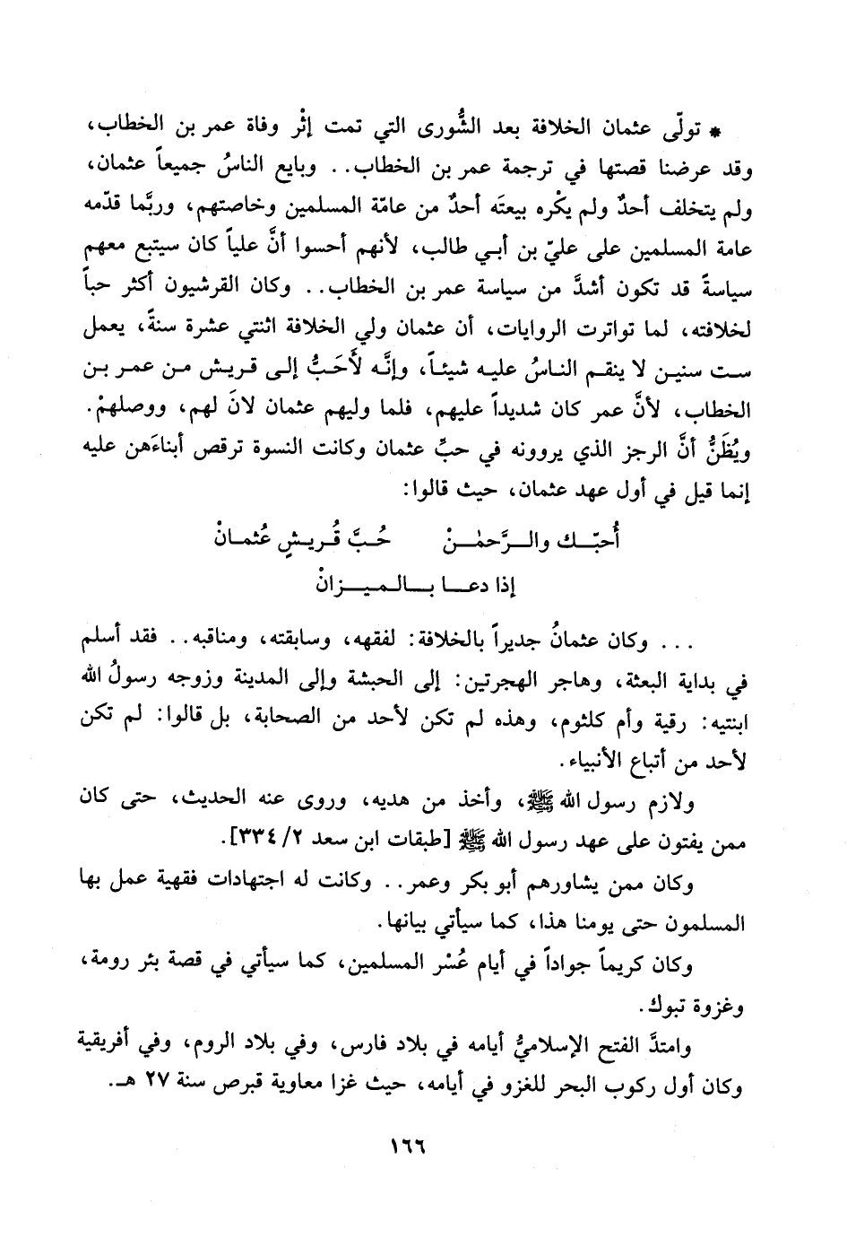 ... وكان عثمانُ جديراً بالخلافة: لفقهه، وسابقته، ومناقبه .. فقد أسلم في بداية البعثة، وهاجر الهجرتين: إلى الحبشة وإلى المدينة وزوجه رسولُ الله ابنتيه: رقية وأم كلثوم، وهذه لم تكن لأحد من الصحابة، بل قالوا: لم تكن لأحد من أتباع الأنبياء.