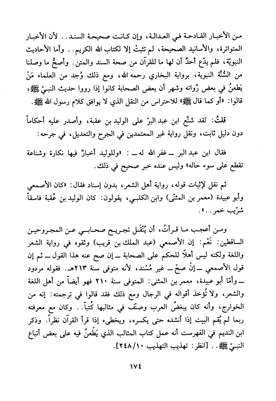 ومن أعجب ما قرأتُ، أن يُنْقَل تجريح صحابي عن المجروحين الساقطين: نَعْم: إن الأصمعي (عبد الملك بن قريب) وثقوه في رواية الشعر واللغة ولكنه ليس أهلاً للحكم على الصحابة ـ إن صح عنه هذا القول ـ ثم إن قول: [الأصمعي ـ إنْ صحّ ـ غير مُسند، لأنه متوفى سنة 213 هـ. فقوله مردود ـ وأمّا أبو عبيدة، معمر بن المثنى: المتوفى سنة 210 فهو أيضاً من أهل اللغة والشعر، ولا تُؤخذ أقواله في الرجال ومع ذلك فقد قالوا في ترجمته: إنه من الخوارج، وأنه كان يبغضُ العرب وصنّف في مثالبها كُتباً .. وكان مع معرفته ربما لم يُقم البيت إذا أنشده حتى يكسره، ويخطىء إذا قرأ القرآن نظراً. وذكر ابن النديم في الفهرست أنه عمل كتاب المثالب الذي يَطْعنُ فيه على بعض أتباع النبيّ صلى الله عليه وسلم. . [انظر: تهذيب التهذيب 248/ 10].