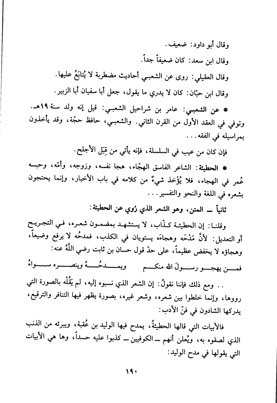 وقلنا: إن الحطيئة كذّاب، لا يستشهد بمضمون شعره، في التجريح أو التعديل: لأنَّ مَدْحَه وهجاءَه يستويان في الكذب، فمدحُه لا يرفع وضيعاً، وهجاؤه لا يخفض عظيماً، على حدّ قول حسان بن ثابت رضي اللَّهُ عنه: فمن يهجو رسولَ الله منكم ويمدحُهُ وينصره سواءُ ..
