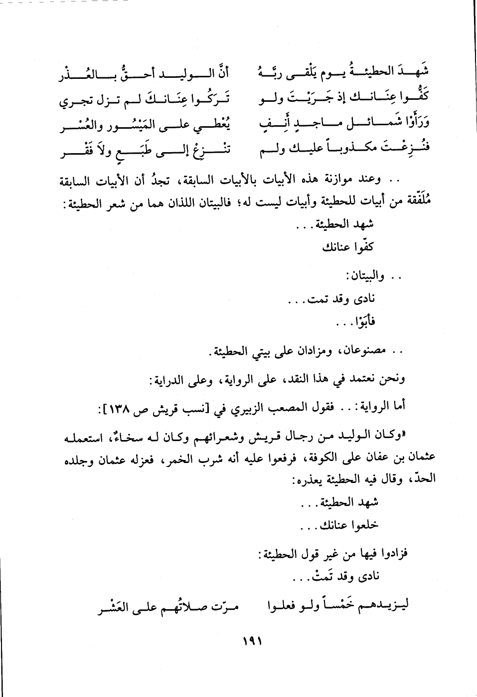 .. وعند موازنة هذه الأبيات بالأبيات السابقة، تجد أن الأبيات السابقة مُلَفْقة من أبيات للحطيئة وأبيات ليست له؛ فالبيتان اللذان هما من شعر الحطيئة: