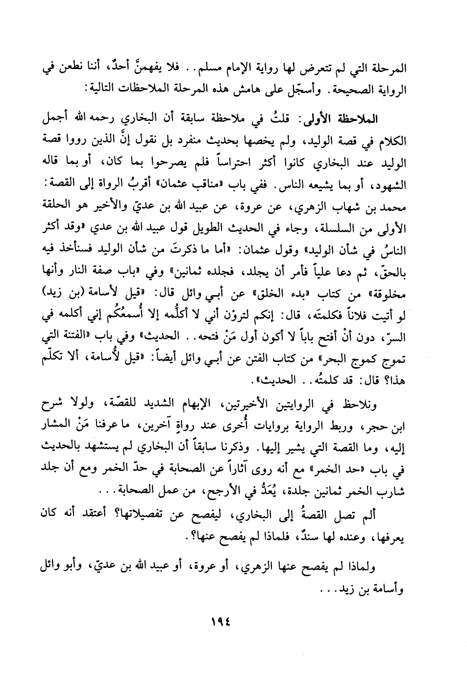 الملاحظة الأولى: قلتُ في ملاحظة سابقة أن البخاري رحمه الله أجمل الكلام في قصة الوليد، ولم يخصها بحديث منفرد بل نقول إن الذين رووا قصة الوليد عند البخاري كانوا أكثر احتراساً فلم يصرحوا بما كان، أو بما قاله الشهود، أو بما يشيعه الناس.