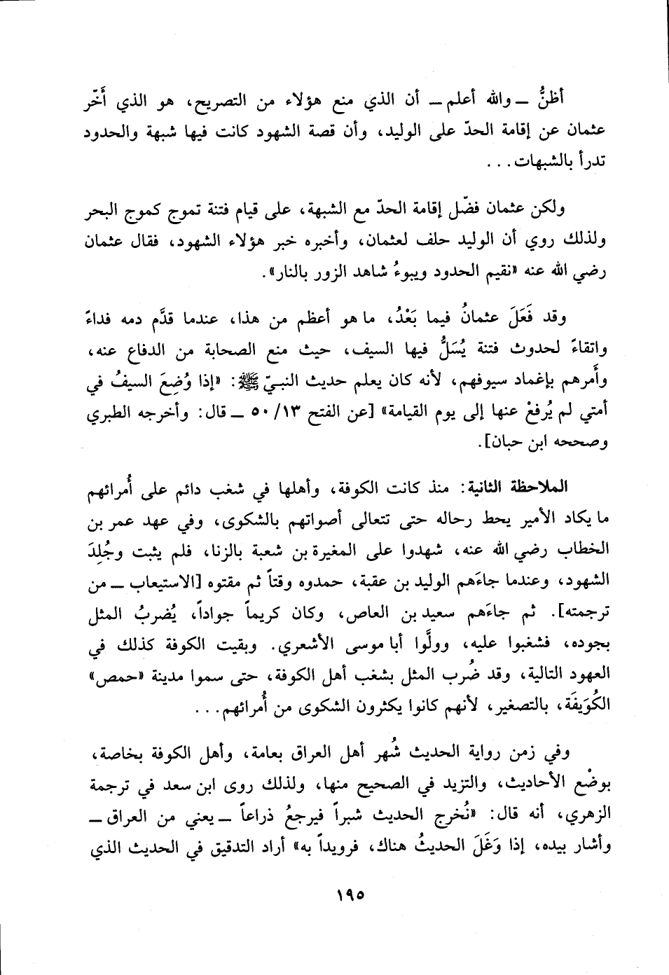 أظنُ ـ والله أعلم ـ أن الذي منع هؤلاء من التصريح، هو الذي أَخّر عثمان عن إقامة الحدّ على الوليد، وأن قصة الشهود كانت فيها شبهة والحدود تدرأ بالشبهات ... ولكن عثمان فضّل إقامة الحدّ مع الشبهة، على قيام فتنة تموج كموج البحر ولذلك روي أن الوليد حلف لعثمان، وأخبره خبر هؤلاء الشهود، فقال عثمان رضي الله عنه "نقم الحدود ويبوءُ شاهد الزور بالنار".