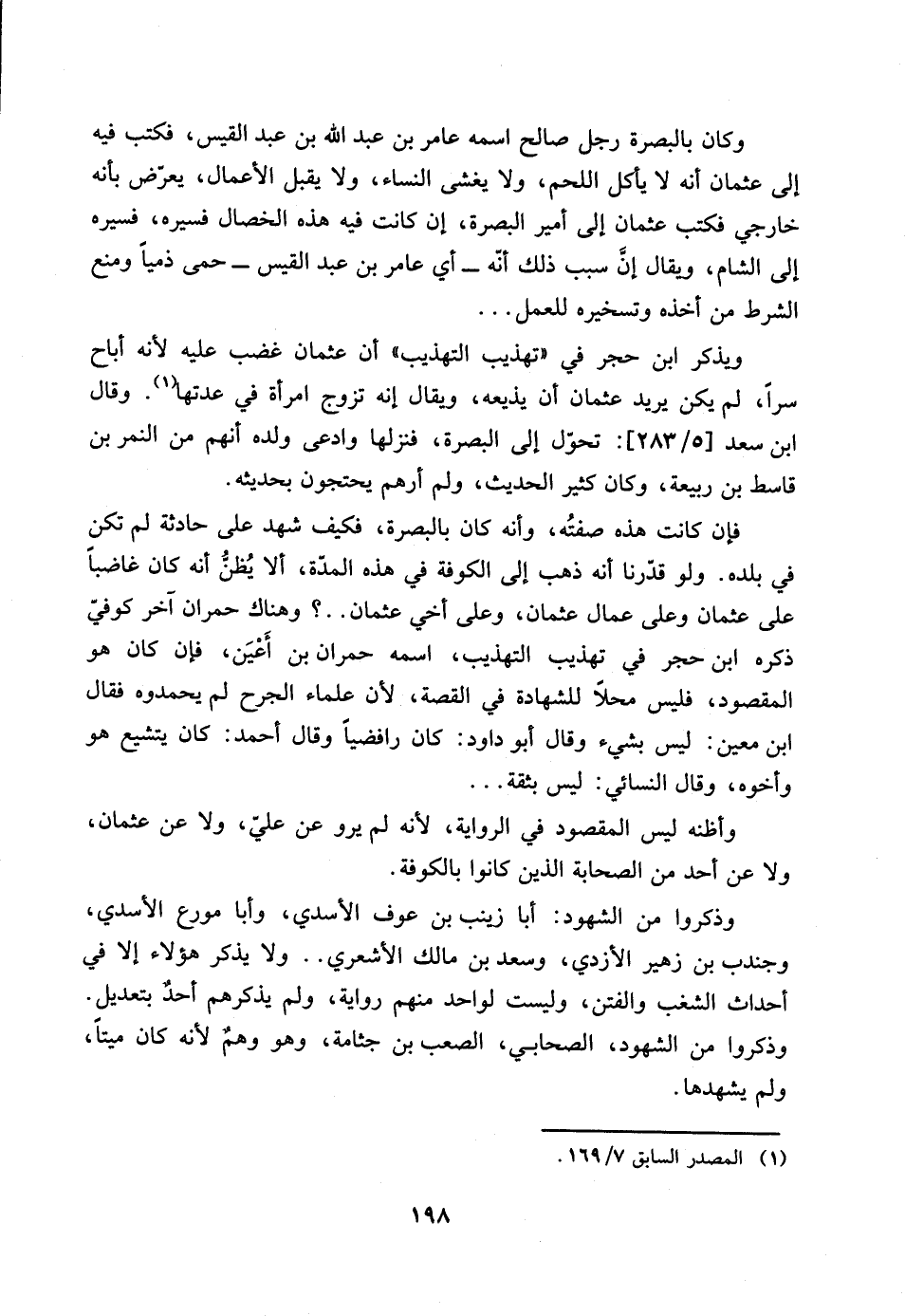 198…وكان بالبصرة رجل صالح اسمه عامر بن عبد الله بن عبد القيس، فكتب فيه إلى عثمان أنه لا يأكل اللحم، ولا يغشى النساء، ولا يقبل الأعمال، يعرّض بأنه خرجي فكتب عثمان إلى أمير البصرة، إن كانت فيه هذه الخصال فسيره، فسيره إلى الشام، ويقال إنَّ سبب ذلك أنّه ـ أي عامر بن عبد القيس ـ حمر ذمياً ومنع الشرط من أخذه وتسخيره للعمل ... ويذكر ابن حجر في "تهذيب التهذيب" أن عثمان غضب عليه لأنه أباح سراً، لم يكن يريد عثمان أن يذيعه، ويقال إنه تزوج امرأة في عدتها (1).