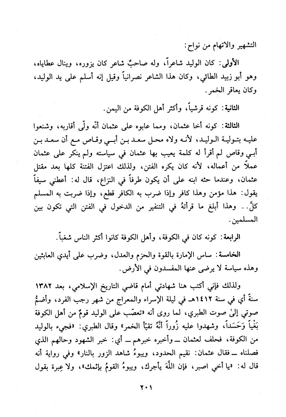 ولذلك فإني أكتب هنا شهادتي أمام قاضي التاريخ الإسلامي، بعد 1382 سنةً أي في سنة 1412هـ في ليلة الإسراء والمعراج من شهر رجب الفرد، وأضمُّ صوتي إلى صوت الطبري، لما روى أنه "تعصّب على الوليد قومٌ من أهل الكوفة بَغْياً وَحَسَداً، وشهدوا عليه زُوراً أنَّهُ تقيّأ الخمر" وقال الطبري: "فجيء بالوليد من الكوفة، فحلف لعثمان ـ وأخبره خبرهم ـ أي: خبر الشهود وحالهم الذي فصلناه ـ فقال عثمان: نقيم الحدود، ويبوءُ شاهد الزور بالنار" وفي رواية أنه قال له: "يا أخي اصبر، فإن اللَّهَ يأجرك، ويبوءُ القومُ بإثمك"، ولا عِبرة بقول…