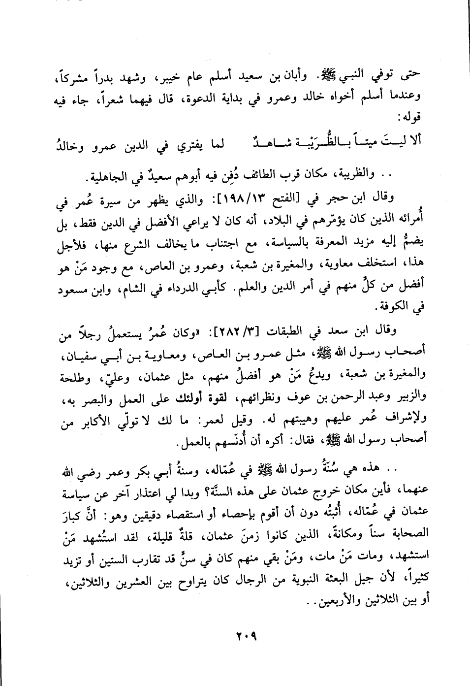 وقيل لعمر: ما لك لا تولّي الأكابر من أصحاب رسول الله صلى الله عليه وسلم، فقال: أكره أن أُدنّسهم بالعمل ... هذه هي سُّنَّةُ رسول الله صلى الله عليه وسلم في عُمّاله، وسنةُ أبي بكر وعمر رضي الله عنهما، فأين مكان خروج عثمان على هذه السنَّة؟ وبدا لي اعتذار آخر عن سياسة عثمان في عُمّاله، أُثبتُه دون أن أقوم بإحصاء أو استقصاء دقيقين وهو: أنَّ كبارَ الصحابة سناً ومكانةً، الذين كانوا زَمَنَ عثمان، قلةٌ قليلة، لقد استُشهد مَنْ استشهد، ومات مَنْ مات، ومَنْ بقي منهم كان في سنٍّ ق تقارب الستين أو تزيد كثيراً، لأن جيل البعثة النبوية من الرجال كان يتراوح بين العشرين والثلاثين، أو بين الثلاثين والأربعين .. …