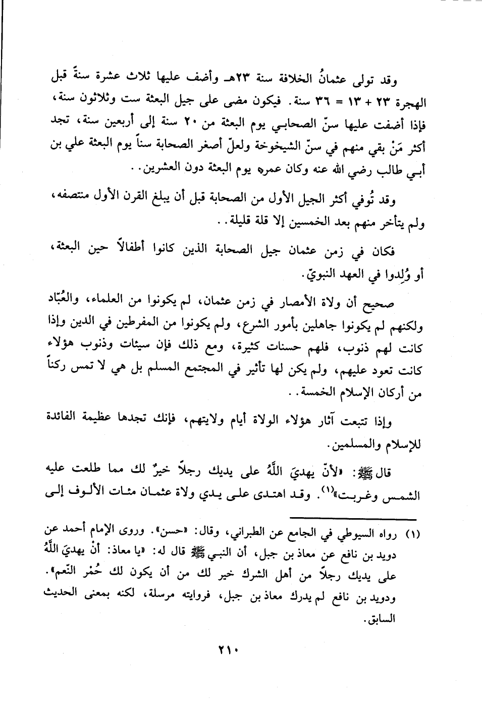 (1) رواه السيوطي في الجامع عن الطبراني، وقال: "حسن". وروى الإمام أحمد عن دويد بن نافع عن معاذ بن جبل، أن النبي صلى الله عليه وسلم قال له: "يا معاذ: أنْ يهديّ اللَّهُ على يديك رجلاً من أهل الشرك خير لك من أن بكون لك حُمْر النّعم". ودويد بن نافع لم يدرك معاذ بن جبل، فروايته مرسلة، لكنه بمعنى الحديث السابق.
