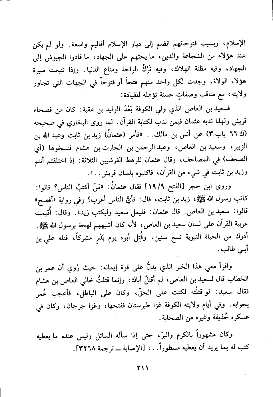 وروى ابن حجر [الفتح 19/ 9] فقال عثمانُ: "مَنْ أكتبُ الناس؟ قالوا: كاتب رسول الله صلى الله عليه وسلم , زيد بن ثابت , قال: فأيُّ الناس أعرب؟ وفي رواية "أفصح" قالوا: سعيد بن العاص. قال عثمان: فليمل سعيد وليكتب زيد ". وقال: أُقيمت عربية القرآن على لسان سعيد بن العاص لأنه كان أشبههم لهجة برسول الله - صلى الله عليه وسلم -. أدرك من الحياة النبوية تسع سنين , وقُتِل أبوه يوم بَدْرٍ مشركاً , قتله علي بن أبي طالب.