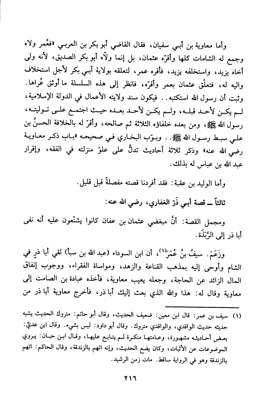 وزَعَمَ. سيفُ بنُ عُمَرَ (1)، أن ابن السوداء (عبد الله بن سبأ) لقي أبا ذرٍ في الشام وأوحى إليه بمذهب القناعة والزهد، ومواساة الفقراء، ووجوب إنفاق المال الزائد عن الحاجة، وجعله يعيب معاوية، فأخذه عبادة بن الصامت إلى معاوية وقال له: هذا والله الذي بعث إليك أبا ذر، فأخرج معاوية أبا ذر من…