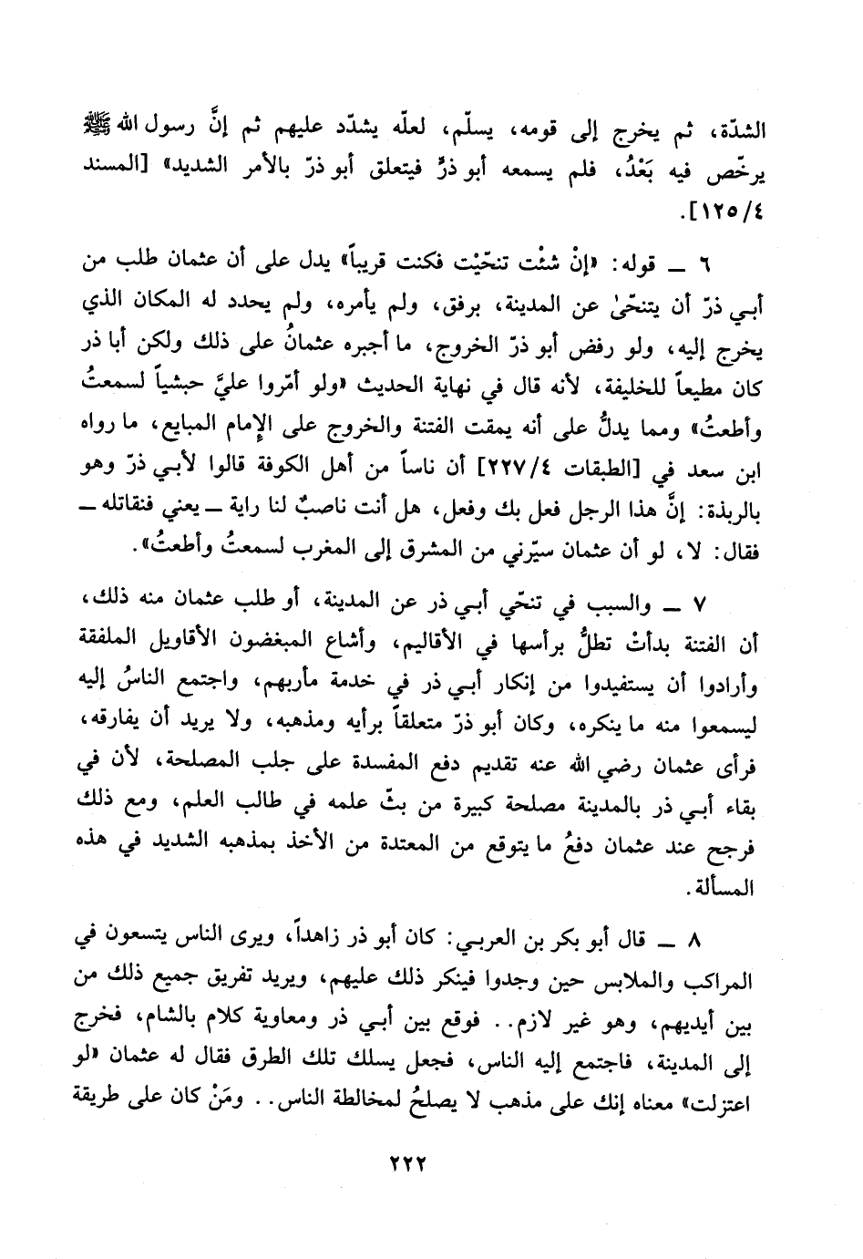 8 ـ قال أبو بكر بن العربي: كان أبو ذر زاهداً، ويرى الناس يتسعون في المراكب والملابس حين وجدوا فينكر ذلك عليهم، ويريد تفريق جميع ذلك من بين أيديهم، وهو غير لازم .. فوقع بين أبي ذر ومعاوية كلام في الشام، فخرج إلى المدينة، فاجتمع إليه الناس، فجعل يسلك تلك الطرق فقال له عثمان "لو اعتزلت" معناها إنك على مذهب لا يصلحُ لمخالطة الناس .. ومَنْ كان على طريقة…
