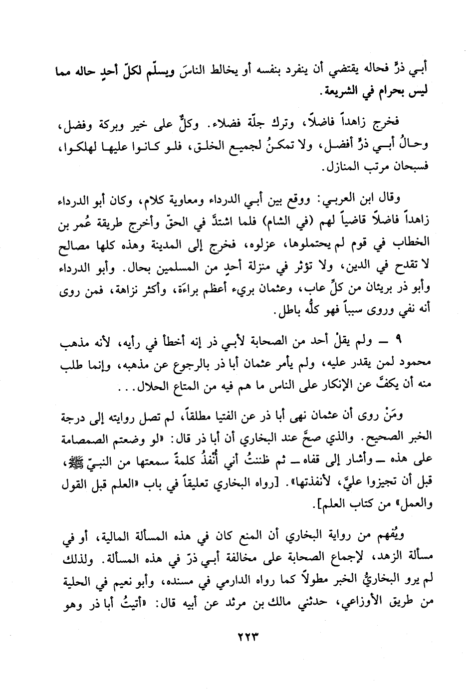 9 ـ ولم يقلْ أحد من الصحابة لأبي ذر إنه أخطأ في رأيه، لأنه مذهب محمود لمن يقدر عليه، ولم يأمر عثمان أبا ذر بالرجوع عن مذهبه، وإنما طلب منه أن يكفَّ عن الإنكار على الناس مل هم فيه من المتاع الحلال ... ومَنْ روى أن عثمان نهى أبا ذر عن الفتيا مطلقاً، لم تصل روايته إلى درجة الخبر الصحيح.