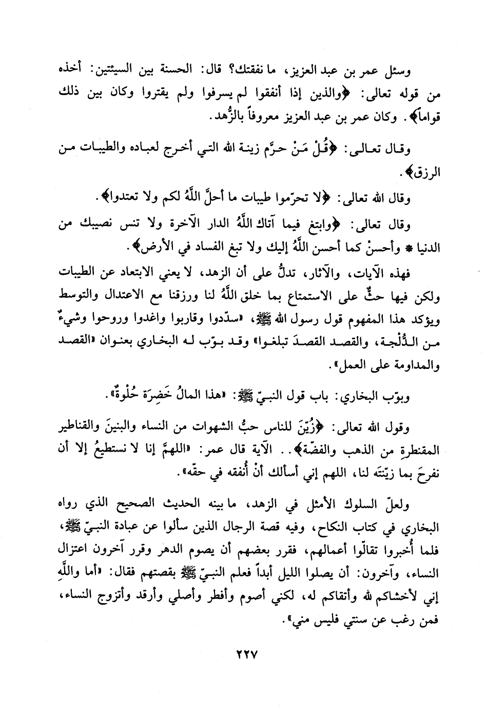 فهذه الآيات، والآثار، تدلُّ على أن الزهد، لا يعني الابتعاد عن الطيبات ولكن فيها حثٌّ على الاستماع بما خلق اللَّهُ لنا ورزقنا مع الاعتدال والتوسيط ويؤكد هذا المفهوم قول رسول الله صلى الله عليه وسلم، "سدّدوا وقاربوا واغدوا وروحوا وشيءٌ من الدُّلْجة، والقصد القصدَ تبلغوا" وقد بوّب له البخاري بعنوان "القصد والمداومة على العمل".