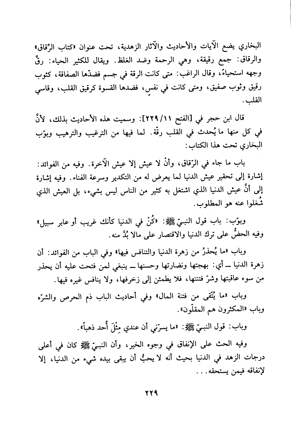وبوّب: باب قول النبيّ صلى الله عليه وسلم: "كُنْ في الدنيا كأنك غريب أو عابر سبيل" وفيه الحضُّ على ترك الدنيا والاقتصار على مالا بُدَّ منه.