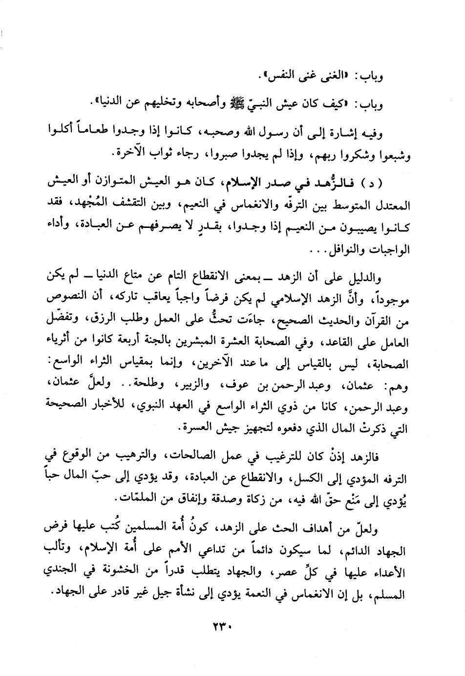(د) فالزُّهد في صدر الإسلام، كان هو العيش المتوازن أو العيش المعتدل المتوسط بين الترفّة والانغماس في النعيم، وبين التقشف المُجْهد، فقد كانوا يصيبون من النعيم إذا وجدوا، بقدرٍ لا يصرفهم عن العبادة، وأداء الواجبات والنوافل ... والدليل على أن الزهد ـ بمعنى الانقطاع التام عن متاع الدنيا ـ لم يكن موجوداً، وأنَّ الزهد الإسلامي لم يكن فرضاً واجباً يعاقب تاركه، أن النصوص من القرآن والحديث الصحيح، جاءَت تحثُّ على العمل وطلب الرزق، وتفضّل العامل على القاعد، وفي الصحابة العشرة المبشرين بالجنة أربعة كانوا من أثرياء الصحابة، ليس بالقياس إلى ما عند الآخرين، وإنما بقياس الثراء الواسع: وهم: عثمان، وعبد الرحمن بن عوف، والزبير، وطلحة .. ولعلَّ عثمان، وعبد الرحمن، كانا من ذوي الثراء الواسع في العهد النبوي، للأخبار الصحيحة التي ذكرتْ المال الذي دفعوه لتجهيز جيش العسرة.