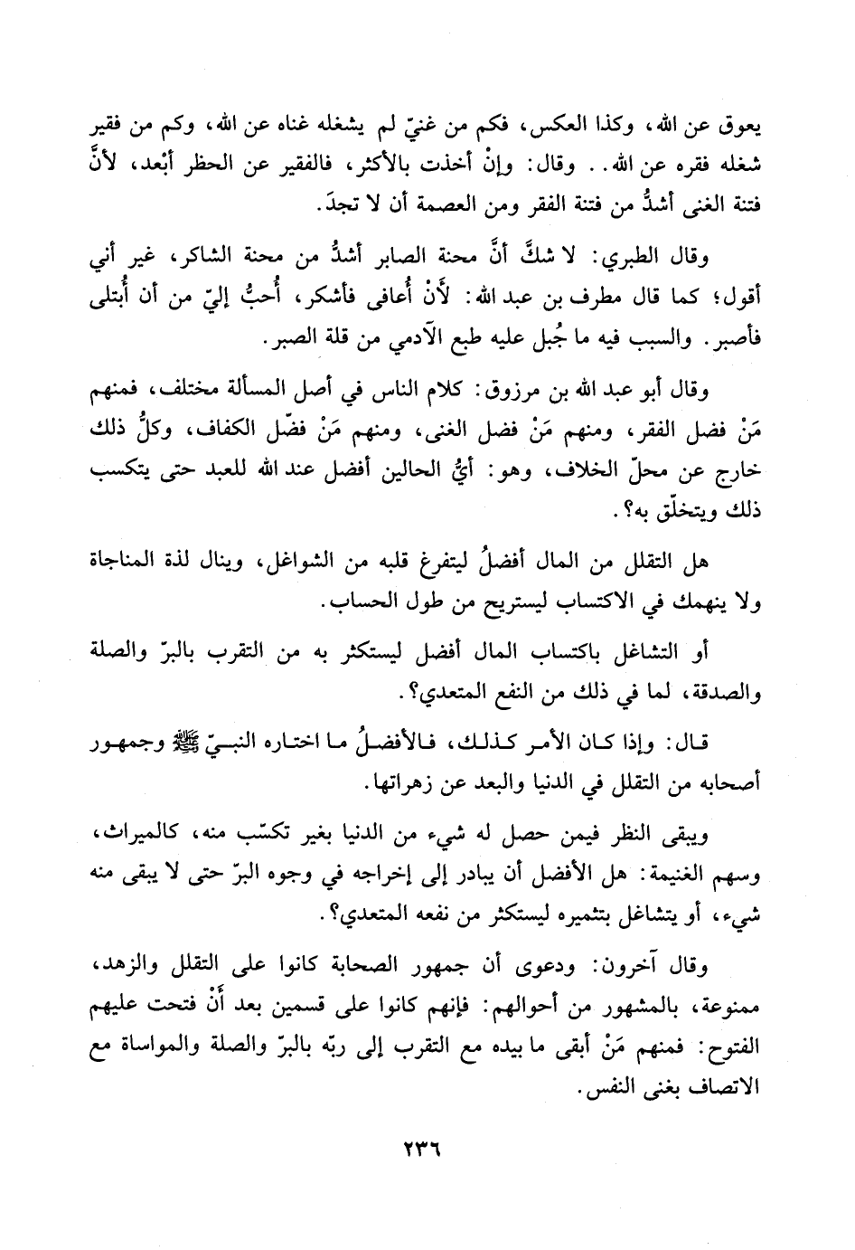 وقال آخرون: ودعوى أن جمهور الصحابة كانوا على التقلل والزهد، ممنوعة، بالمشهور من أحوالهم: فإنهم كانوا على قسمين بعد أَنْ فتحت عليهم الفتوح: فمنهم مَنْ أبقى ما بيده مع التقرب إلى ربّه بالبرّ والصلة والمواساة مع الاتصاف بغنى النفس.