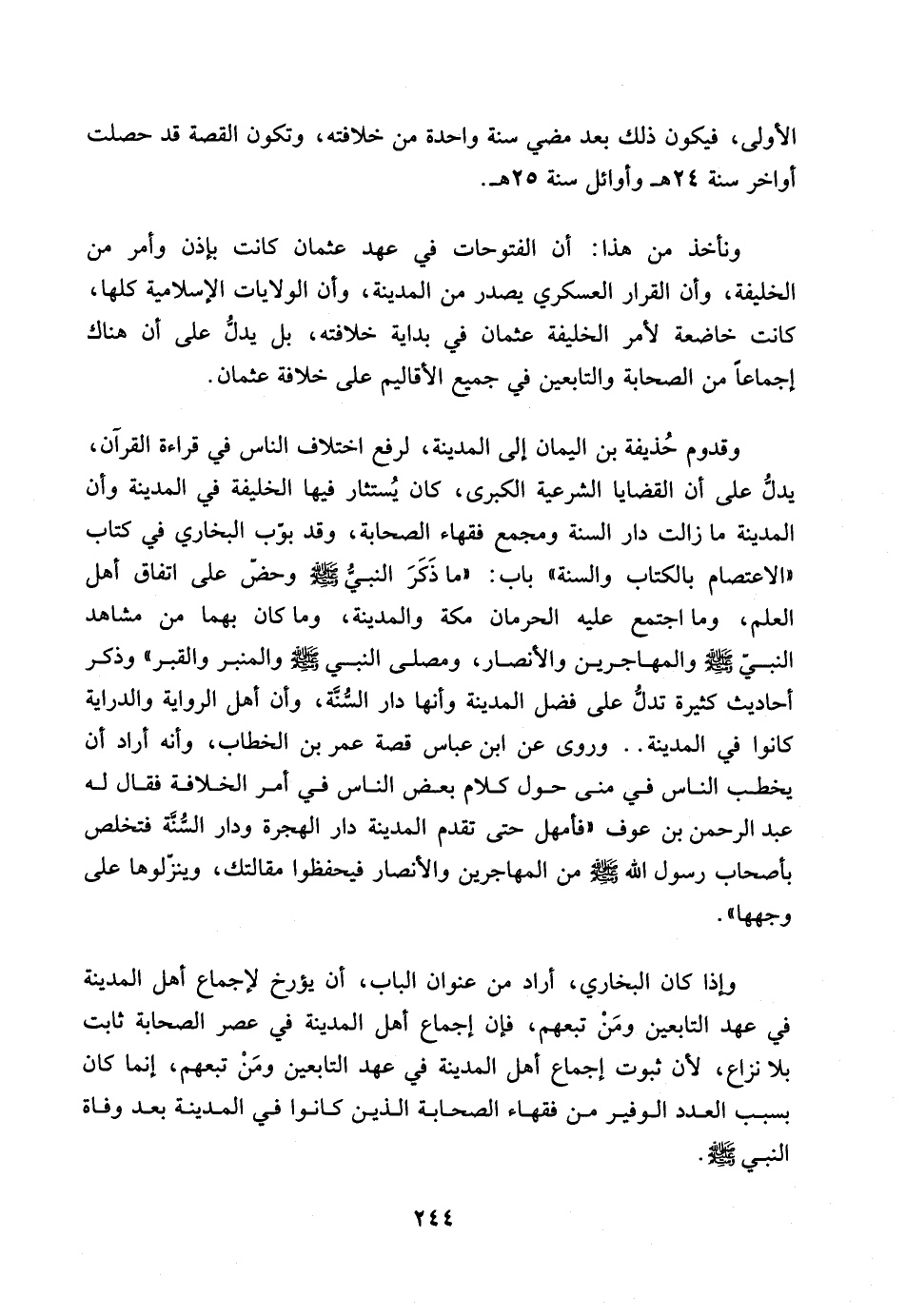 وإذا كان البخاري، أراد من عنوان الباب، أن يؤرخ لإجماع أهل المدينة في عهد التابعين ومَنْ تبعهم، فإن إجماع أهل المدينة في عصر الصحابة ثابت بلا نزاع، لأن ثبوت إجماع أهل المدينة في عهد التابعين ومَنْ تبعهم، إنما كان بسبب العدد الوفير من فقهاء الصحابة الذين كانوا في المدينة بعد وفاة النبي - صلى الله عليه وسلم -