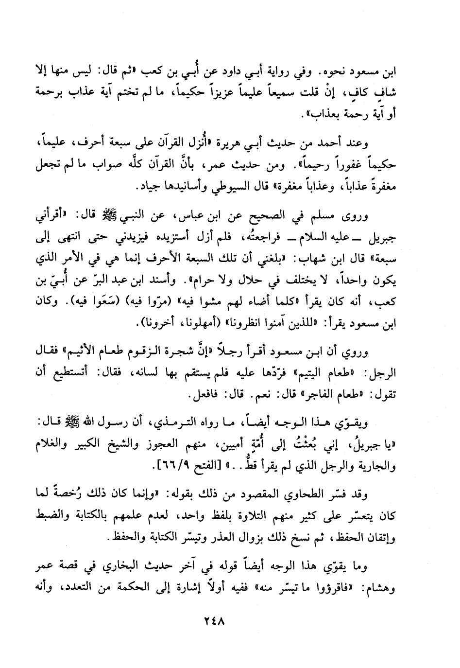 وعند أحمد من حديث أبي هريرة " أُنزل القرآن على سبعة أحرف، عليماً، حكيماً غفوراً رحيماً ". ومن حديث عمر، بأنَّ القرآن كلَّه صواب ما لم تجعل مغفرةً عذاباً، وعذاباً مغفرة " قال السيوطي وأسانيدها جياد.