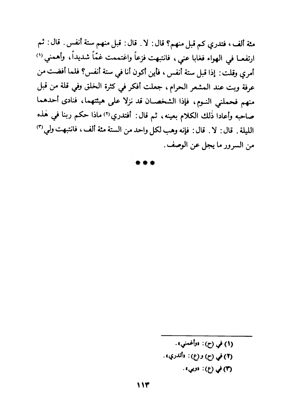 مئة أَلْفٍ، فَتَدْرِي كَمْ قُبِلَ مِنْهُمْ؟ قَالَ: لا. قَالَ: قُبِلَ مِنْهُمْ سِتَّةُ أَنْفُسٍ. قَالَ: ثُمَّ ارْتَفَعَا فِي الْهَوَاءِ فَغَابَا عَنِّي، فَانْتَبَهْتُ فَزِعًا وَاغْتَمَمْتُ غَمًّا شَدِيدًا، وَأَهَمَّنِي أَمْرِي وَقُلْتُ: إِذَا قبل ست أَنْفُسٍ، فَأَيْنَ أَكُونُ أَنَا فِي سِتَّةِ أَنْفُسٍ؟ فَلَمَّا أَفَضْتُ مِنْ عَرَفَةَ وَبِتُّ عِنْدَ الْمَشْعَرِ الْحَرَامِ، جَعَلْتُ أُفَكِّرُ فِي كَثْرَةِ الْخَلْقِ وَفِي قلة من قبل منهم فحملني النَّوْمُ، فَإِذَا الشَّخْصَانِ قَدْ نَزَلا عَلَى هَيْئَتِهِمَا، فَنَادَى أَحَدُهُمَا صَاحِبَهُ وَأَعَادَا ذَلِكَ الْكَلامَ بِعَيْنِهِ، ثُمَّ قَالَ: أَفَتَدْرِي مَاذَا حَكَمَ رَبُّنَا فِي هَذِهِ اللَّيْلَةِ. قَالَ: لا. قَالَ: فَإِنَّهُ وَهَبَ لكل واحد من الستة مئة ألف، فانتبهت ولي مِنَ السُّرُورِ مَا يَجِلُّ عَنِ الْوَصْفِ.