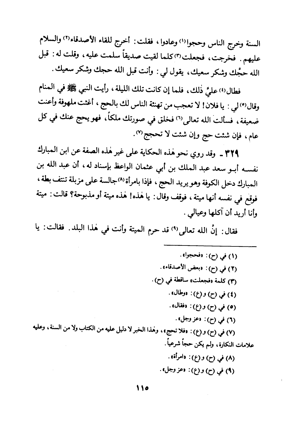 329- وَقَدْ رَوَى نَحْوَ هَذِهِ الْحِكَايَةَ عَلَى غَيْرِ هَذِهِ الصِّفَةِ عَنِ ابْنِ الْمُبَارَكِ نَفْسِهِ أَبُو سعد عَبْدِ الْمَلِكِ بْنِ أَبِي عُثْمَانَ الْوَاعِظُ بِإِسْنَادٍ لَهُ، أَنَّ عَبْدَ اللَّهِ بْنَ الْمُبَارَكِ دَخَلَ الْكُوفَةَ وَهُوَ يُرِيدُ الْحَجَّ، فَإِذَا بِامْرَأَةٍ جَالِسَةٍ عَلَى مَزْبَلَةٍ تَنْتُفُ بَطَّةً، فَوَقَعَ فِي نَفْسِهِ أنها ميتة، فوقف وقال: يا هذه! هذه ميتة أو مذبوحة؟ قالت: مَيْتَةٌ وَأَنَا أُرِيدُ أَنْ آكُلَهَا وَعِيَالِي.