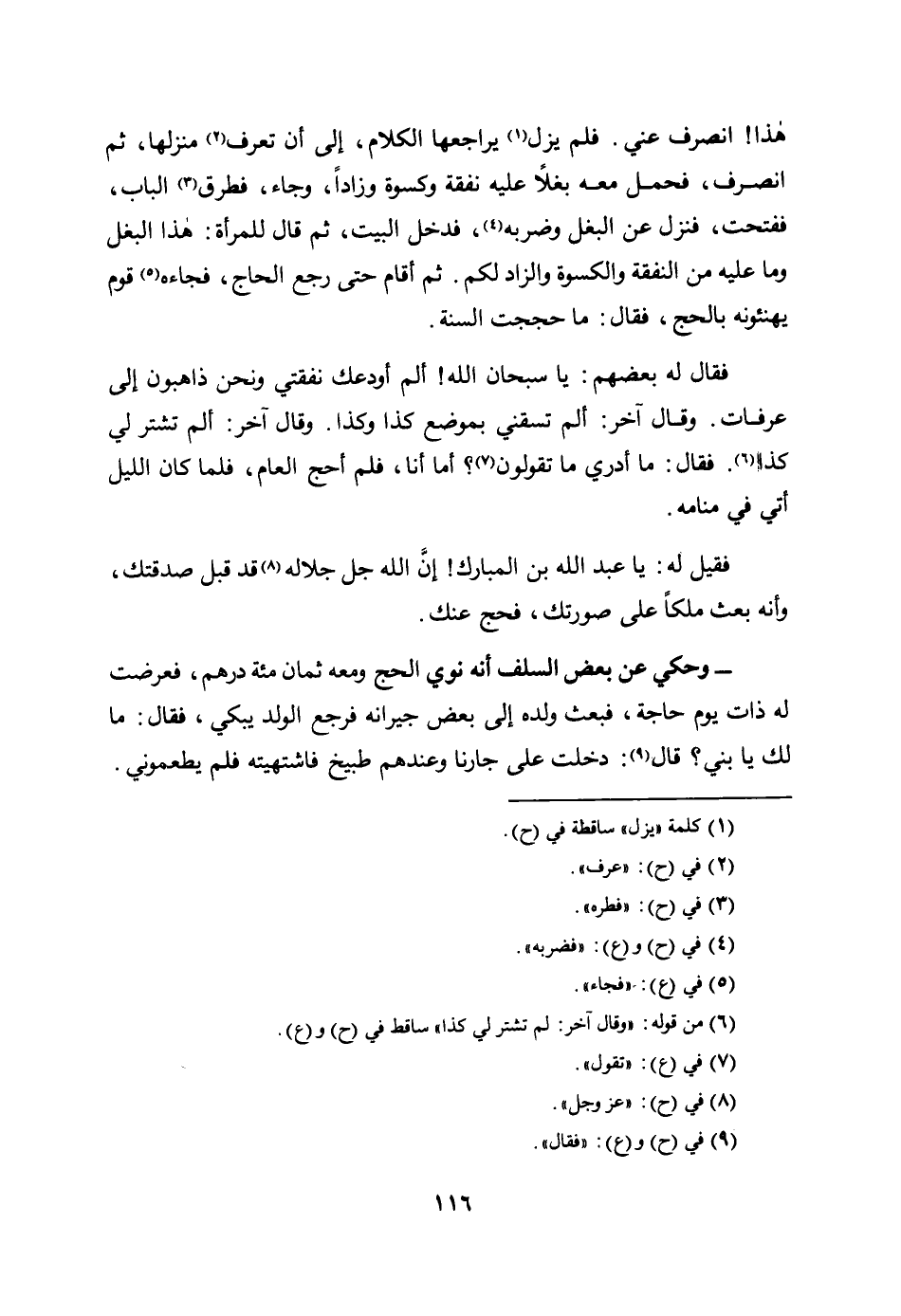 هَذَا! انْصَرِفْ عَنِّي. فَلَمْ يَزَلْ يُرَاجِعُهَا الْكَلامَ، إِلَى أَنْ تَعَرَّفَ مَنْزِلَهَا، ثُمَّ انْصَرَفَ، فَحَمَلَ معه بغلاً عليه نفقة وكسوة وزاداً، وَجَاءَ فَطَرَقَ الْبَابَ، فَفَتَحَتَ، فَنَزَلَ عَنِ الْبَغْلِ وضربه، فَدَخَلَ الْبَيْتَ، ثُمَّ قَالَ لِلْمَرْأَةِ: هَذَا الْبَغْلُ وَمَا عَلَيْهِ مِنَ النَّفَقَةِ وَالْكِسْوَةِ وَالزَّادِ لَكُمْ. ثُمَّ أَقَامَ حَتَّى رَجَعَ الْحَاجُّ، فَجَاءَهُ قَوْمٌ يُهَنِّئُونَهُ بِالْحَجِّ، فَقَالَ: مَا حَجَجْتُ السَّنَةَ.